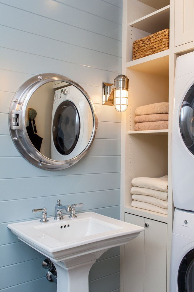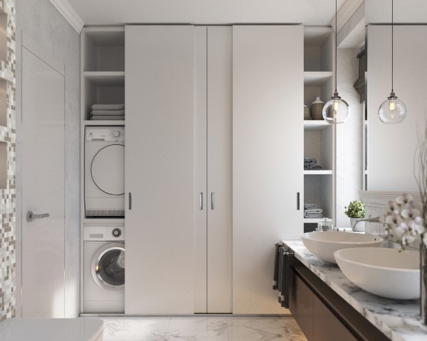 Lá você pode colocar uma máquina de lavar roupa (para o banheiro) ou um forno, um microondas (para a cozinha). Assim, todo o equipamento estará localizado perto um do outro.