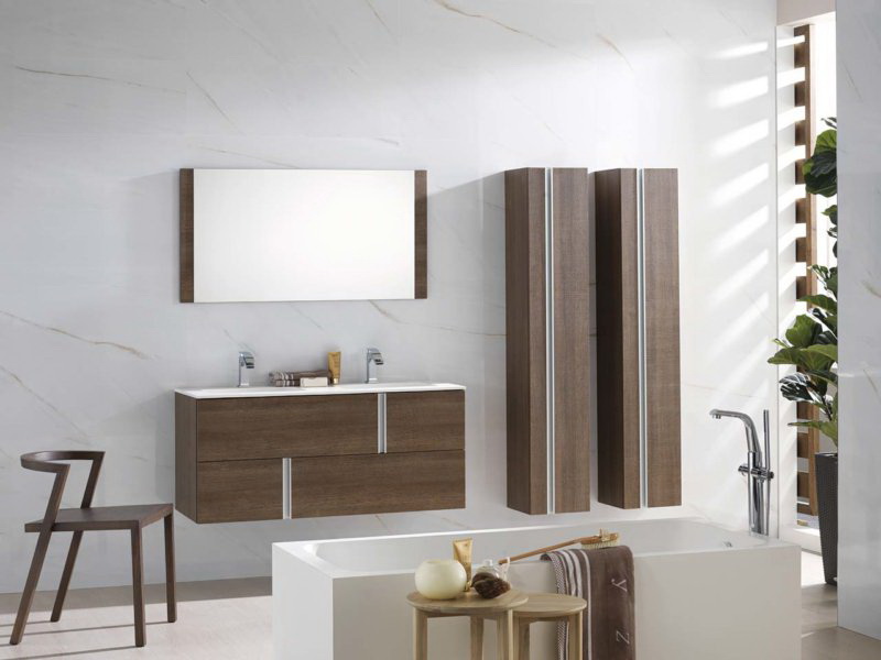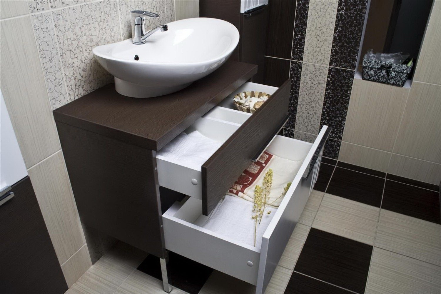 O armário com as pernas está protegido da água que se acumula no chão do banheiro. Tal mobília não é ameaçada com umidade no banheiro.