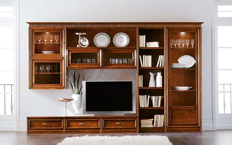 É significativo o inconveniente que, ao coletar tal modelo, você não pode de alguma forma mudar a posição dos elementos na composição. Acima de tudo, essas paredes são adequadas para apartamentos soviéticos e estilos de clássico e vintage.