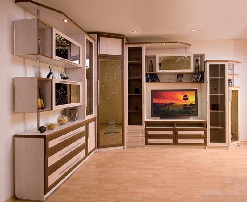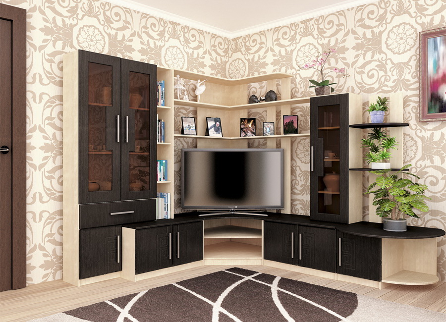 Em princípio, este tipo é bastante similar ao deslizamento angular da parede, com a diferença de que aqui os módulos podem ser completamente qualquer. Projetos de cantos ajudam a economizar espaço, organizando várias coisas para os proprietários em armários e elementos interiores adicionais, como vasos com flores e pinturas em suas prateleiras.