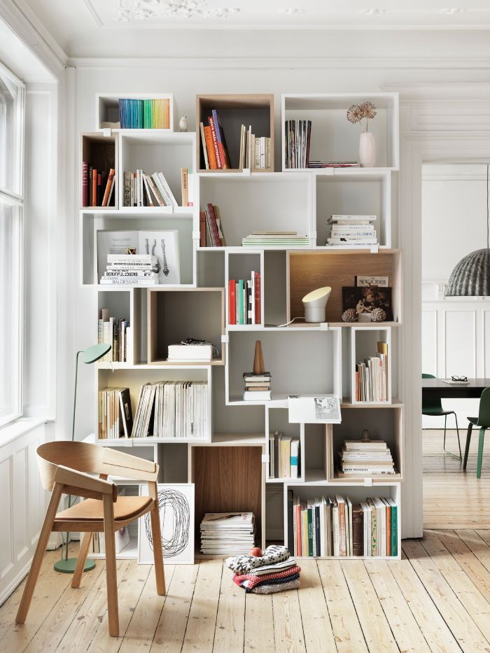 Especialmente bom mobiliário branco para livros vai olhar no fundo de bege, verde-oliva, ouro papel de parede ou gesso.