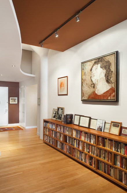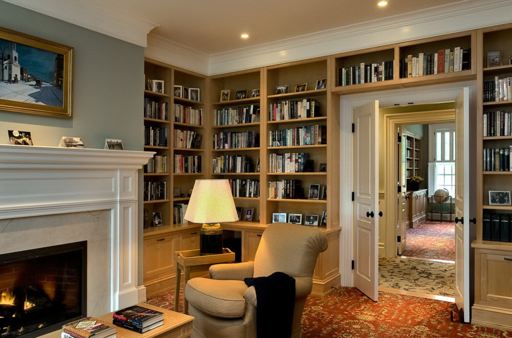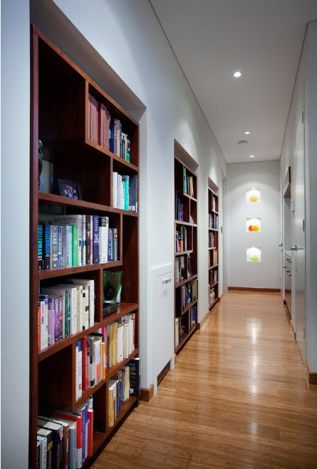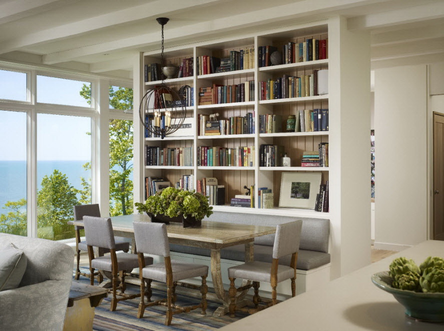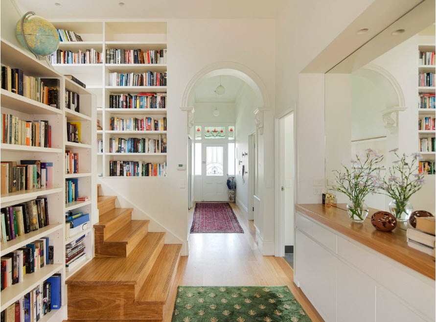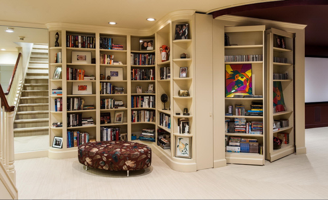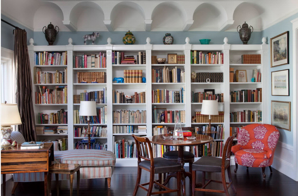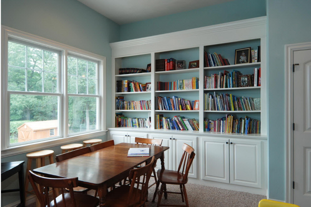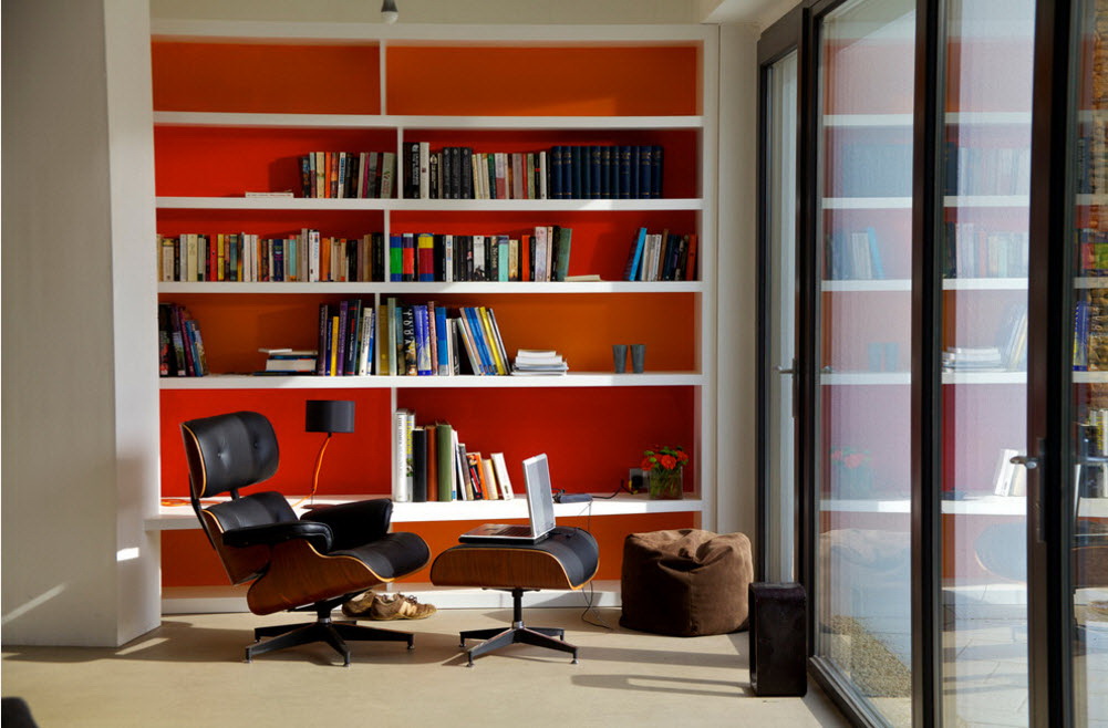 No design moderno, muitas vezes há opções quando uma estante está localizada no corredor, na loggia, e até mesmo em casa de banho. No escritório é melhor colocar ao lado da escrita a mesa e computador. Para colocar mobília em o quarto ou criança Não recomende: devido ao acúmulo de poeira, pode ocorrer uma reação alérgica.