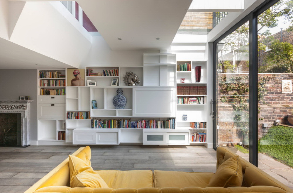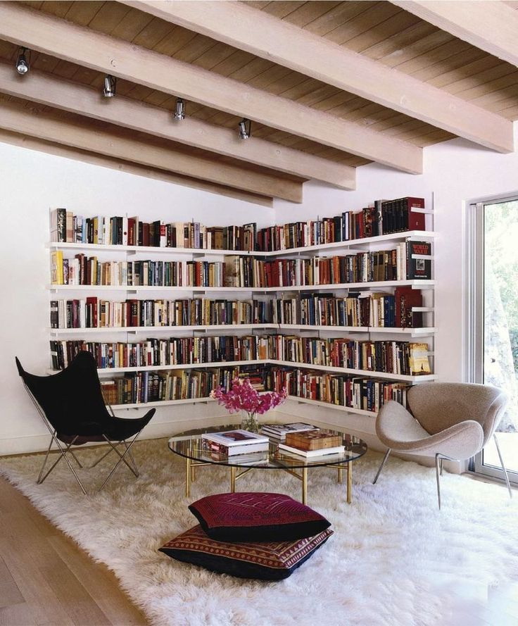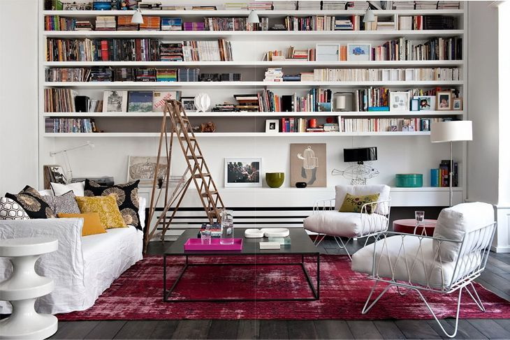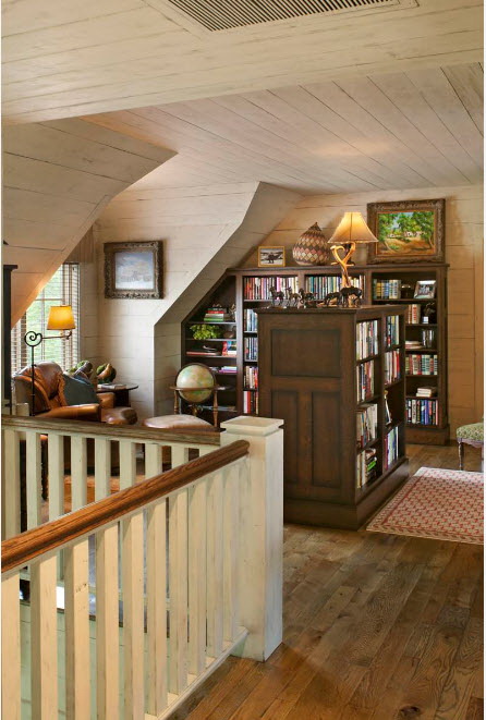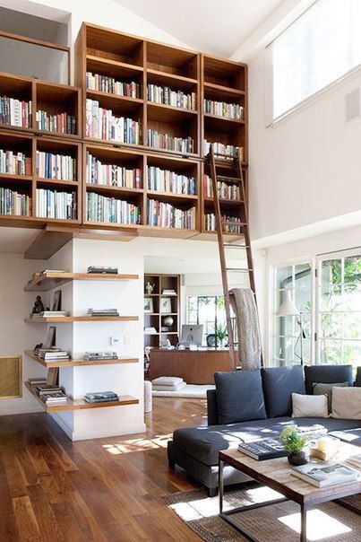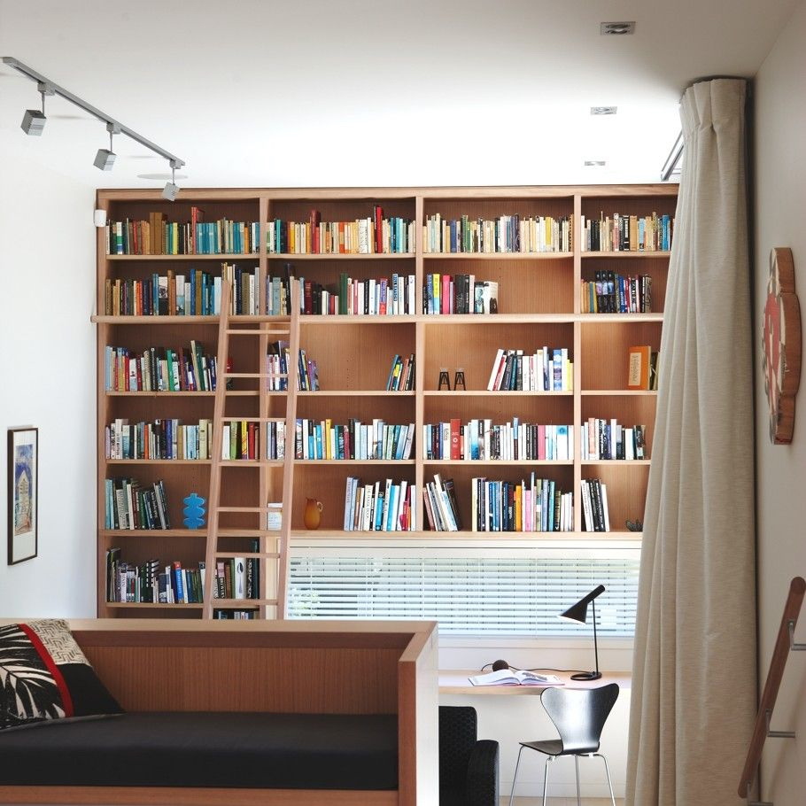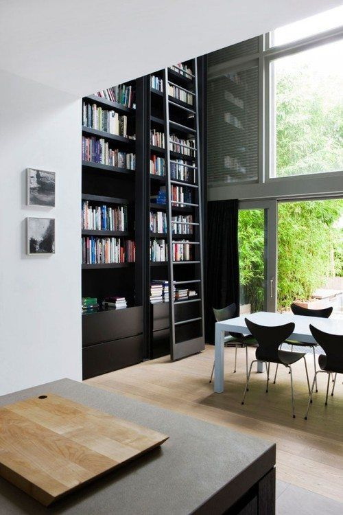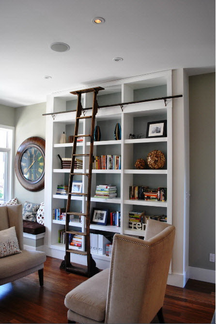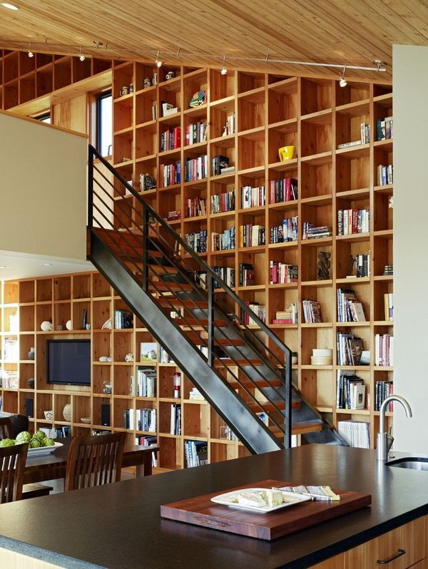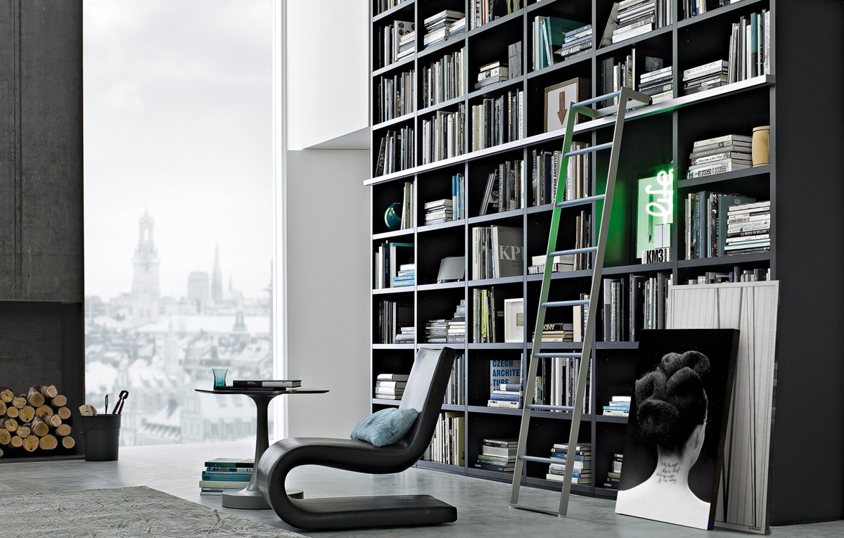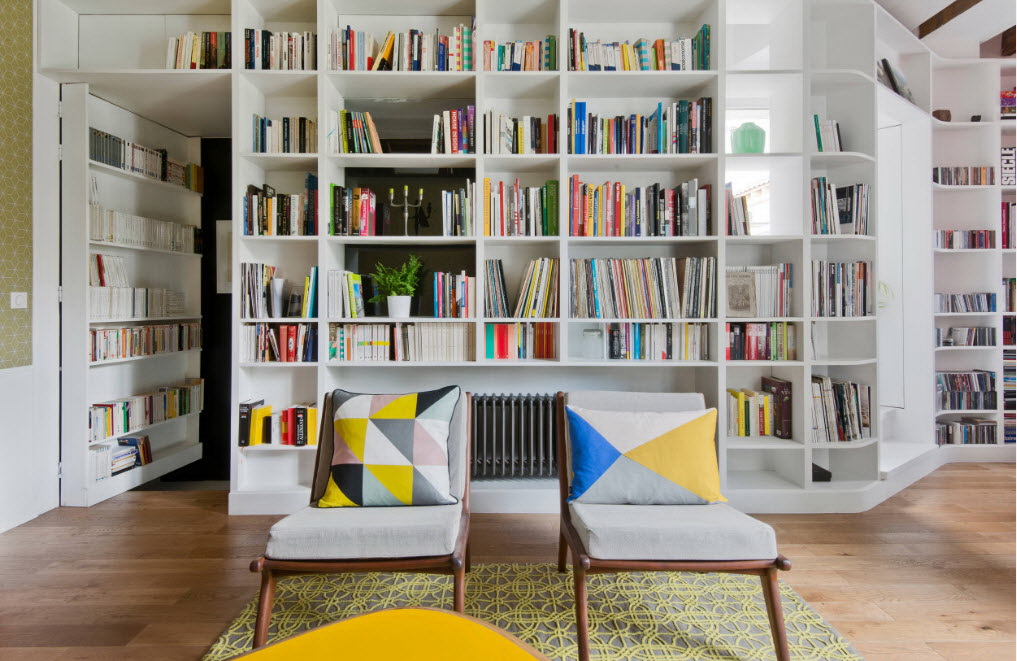 Prateleira para livros parece ótimo em toda a largura e altura da parede. Com esse modelo, você precisa cuidar da entrega conveniente de cópias. Para este propósito, pequenos degraus ou escadas.