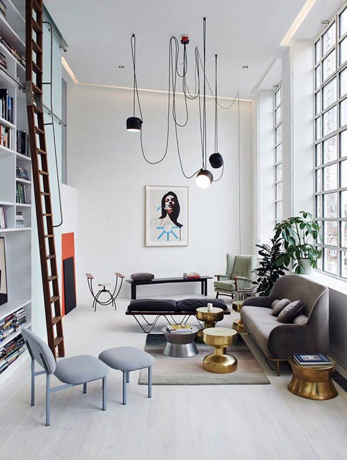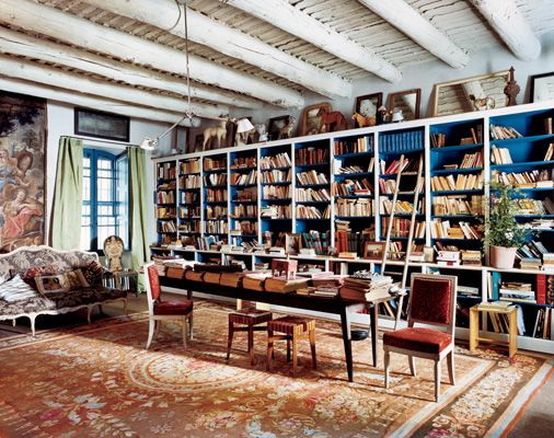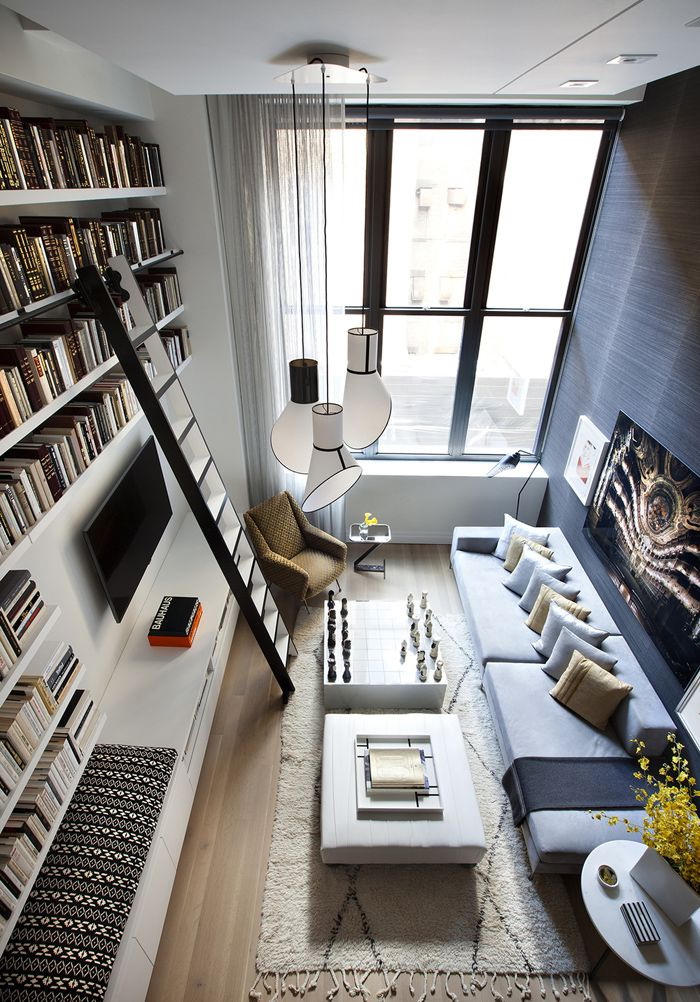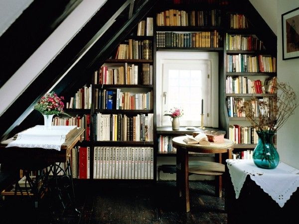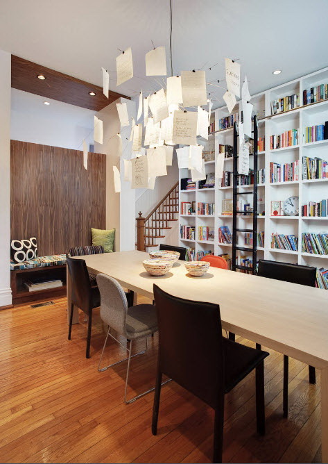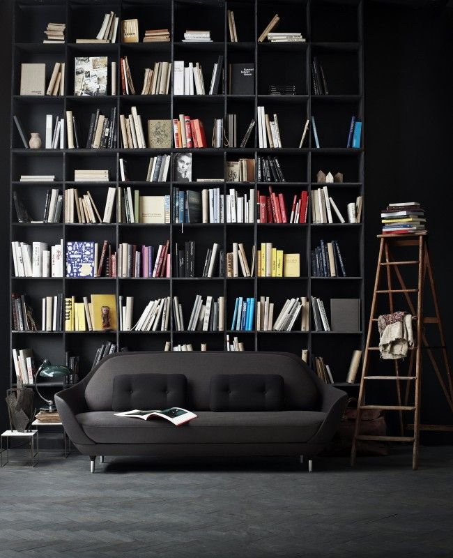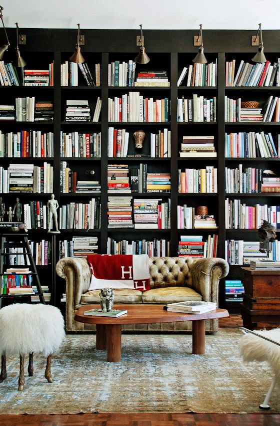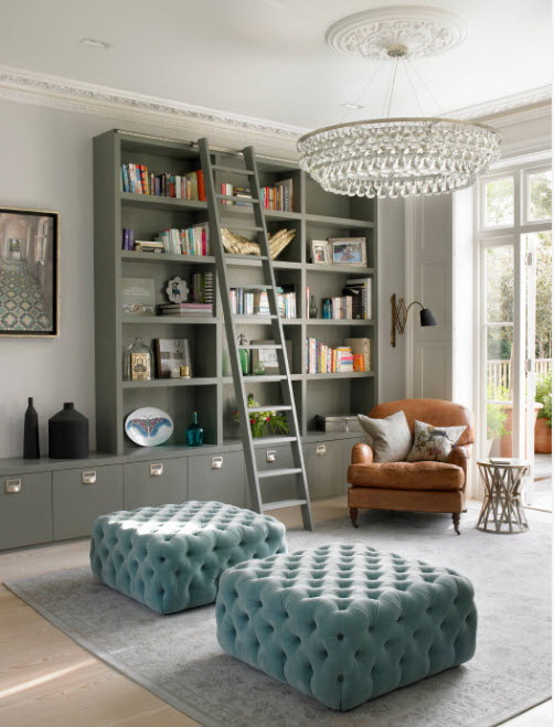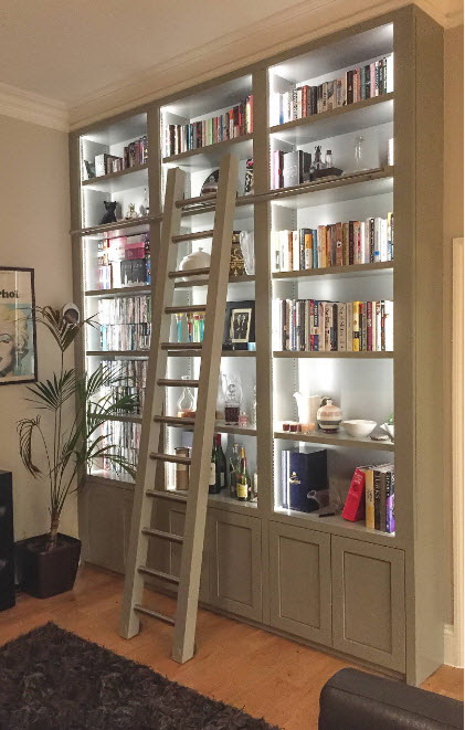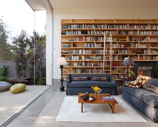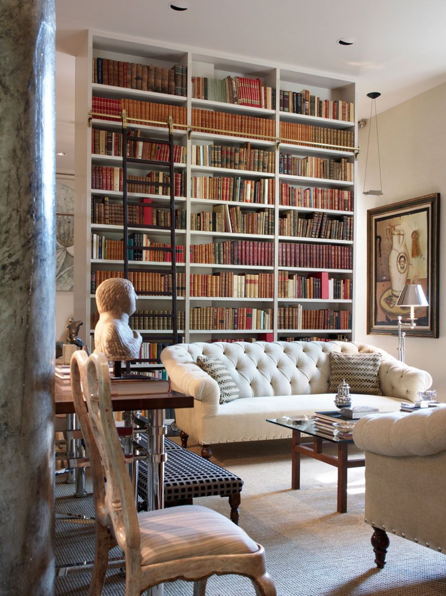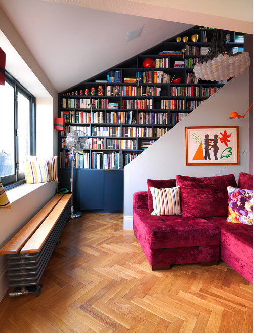 Prateleira para livros parece ótimo em toda a largura e altura da parede. Com esse modelo, você precisa cuidar da entrega conveniente de cópias. Para este propósito, pequenos degraus ou escadas.