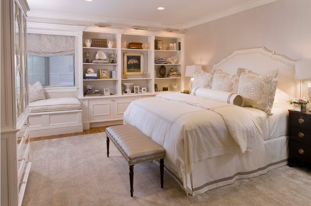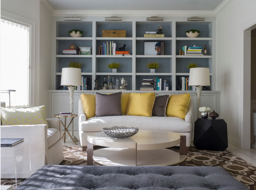 Os modelos brancos para livros, apesar da simplicidade, parecem modernos e incomuns. Eles adicionarão uma falta de refinamento à sala de estar. Os produtos olham com móveis de tons pastéis, cores preto e marrom.