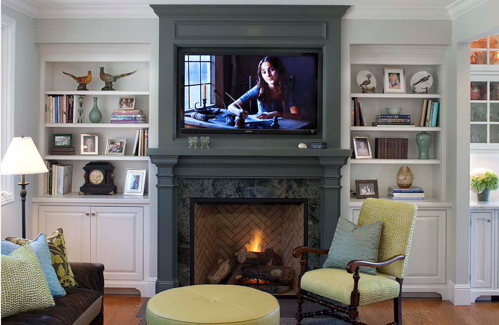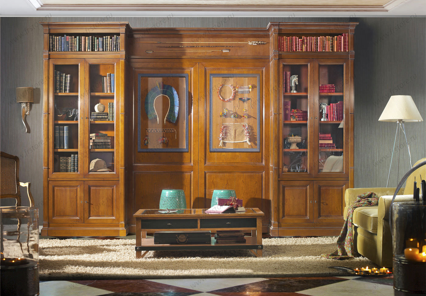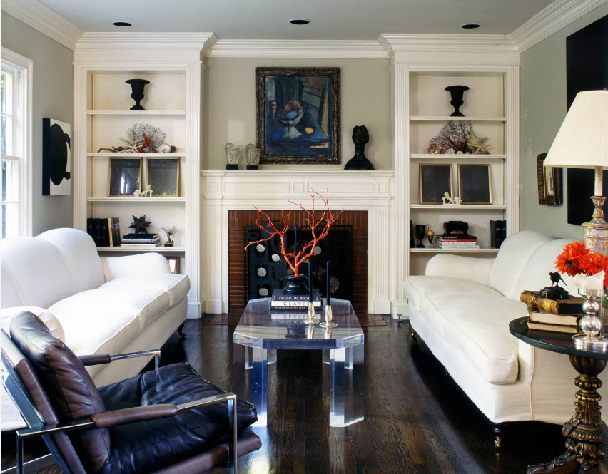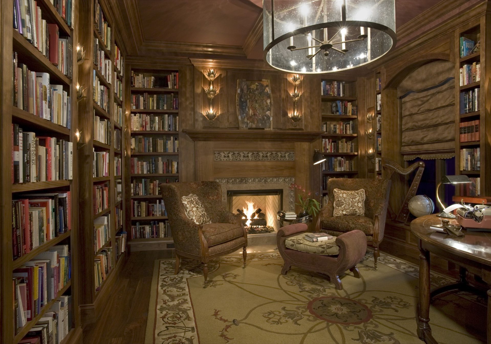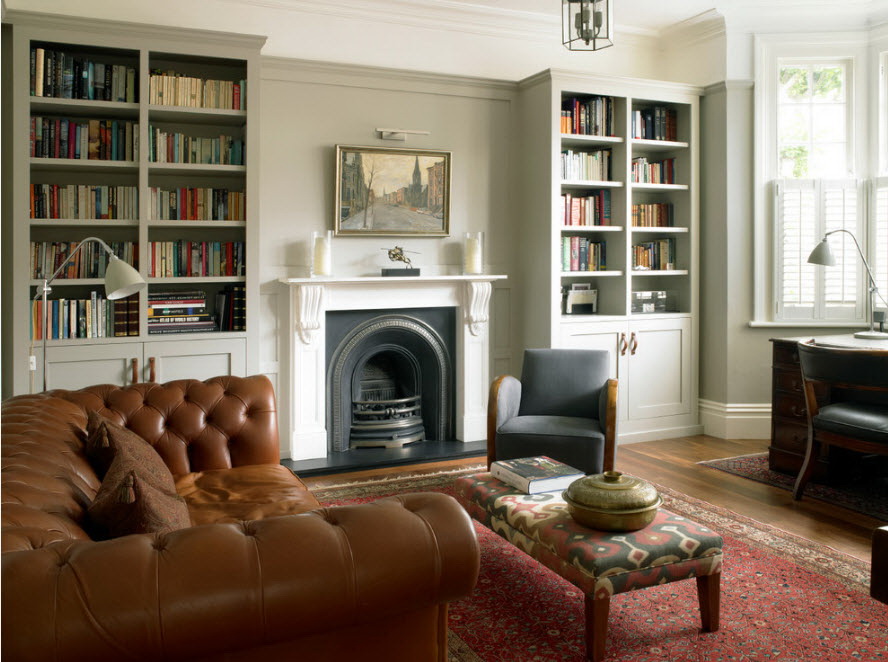 Interior antigo e lareira antiga - uma grande empresa para uma estante maciça. Você pode encomendar um produto para livros da mesma linha de móveis que o restante dos itens da sala. Os produtos de uma fábrica são sempre combinados harmoniosamente.