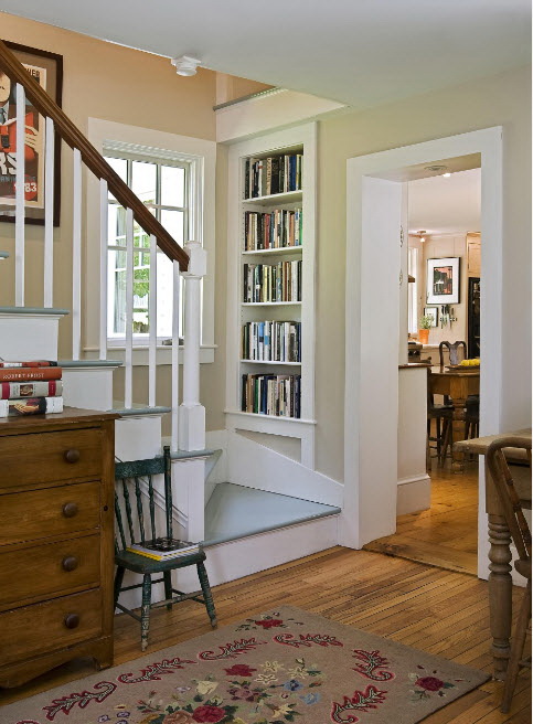 Um modelo estreito para livros é ideal se você tiver um pequeno planoem que há pouco espaço. Parece ótimo no interior no estilo da Provence. Tais projetos não atraem muita atenção, desempenhando um papel secundário.