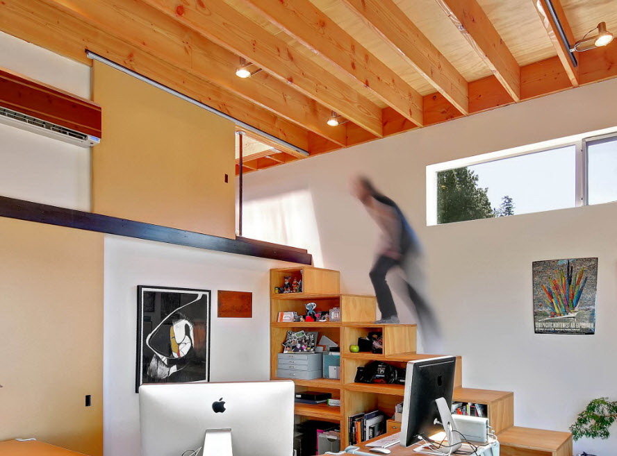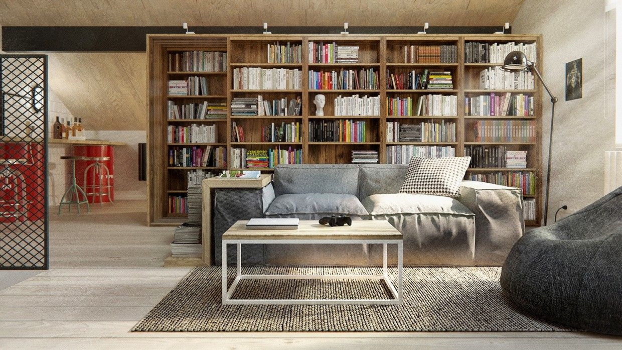 Quarto em estilo sótão Decore o modelo com um arranjo caótico das prateleiras. É melhor escolher um design de uma matriz de cor escura.