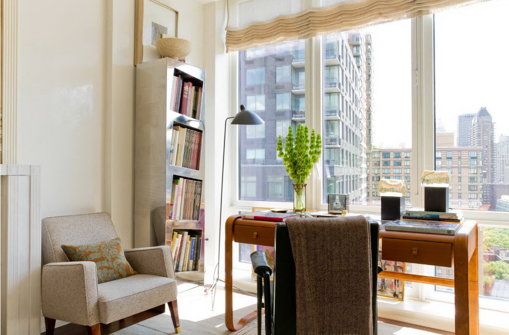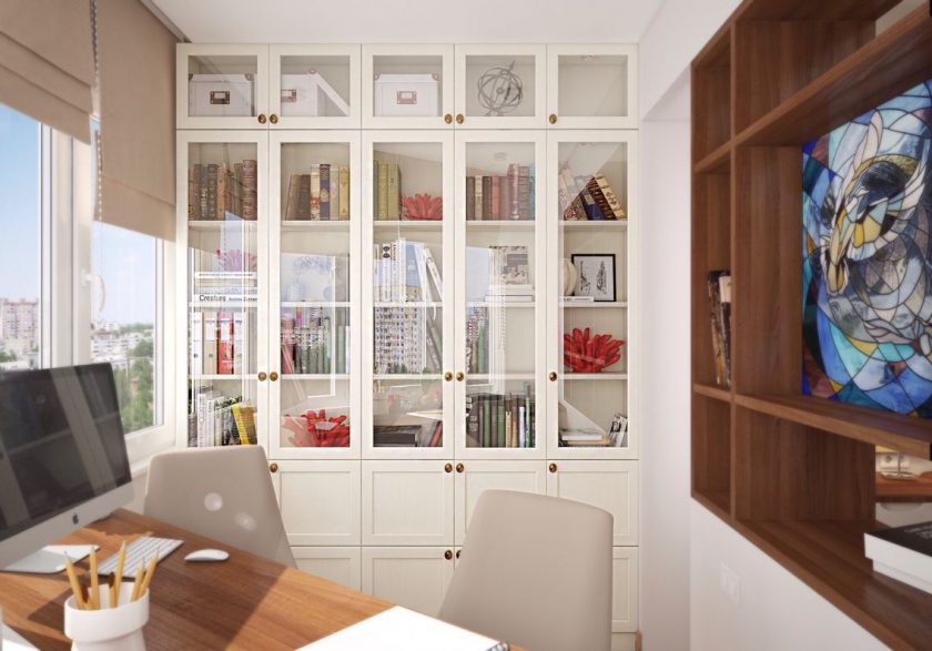 Mobiliário estreito com uma porta de vidro parece sofisticado e elegante. Instalá-lo em um escritório espaçoso não é desejável. Lá ela estará perdida. É melhor decorar seu local de trabalho na loggia ou na sala de estar.