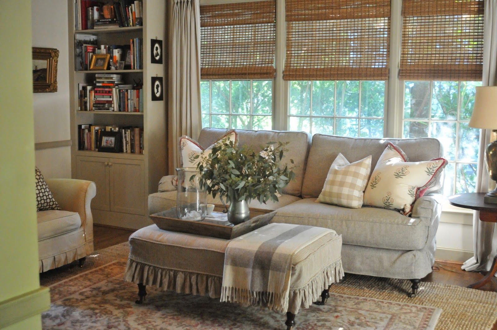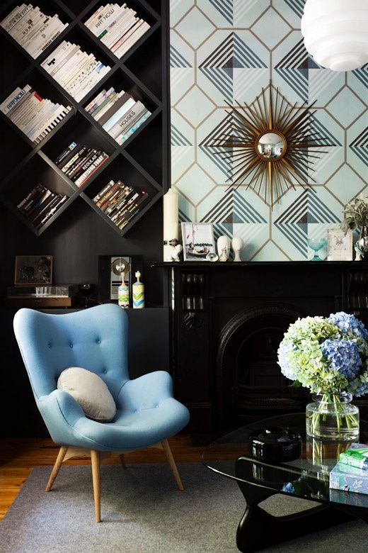 Design de guarda-roupa para livros parece ótimo com papel de parede com estampa floral, cadeira de vime, móveis antigos.