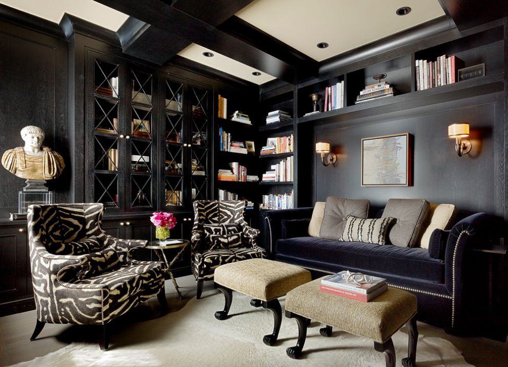 O mobiliário preto puro é percebido por muitos como sombrio e arriscado. Esta é uma visão equivocada. Armário lacado preto parece extravagante e original no estudo ou sala de estar. Para o berçário, você pode escolher cores mais brilhantes - verdeazul, pêssego.