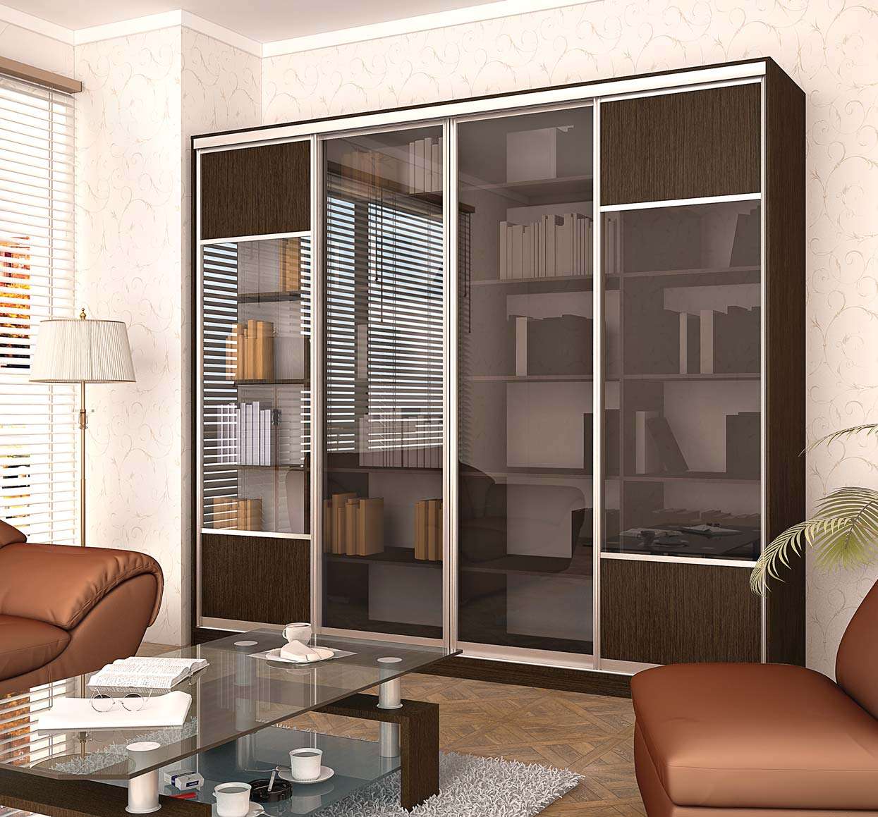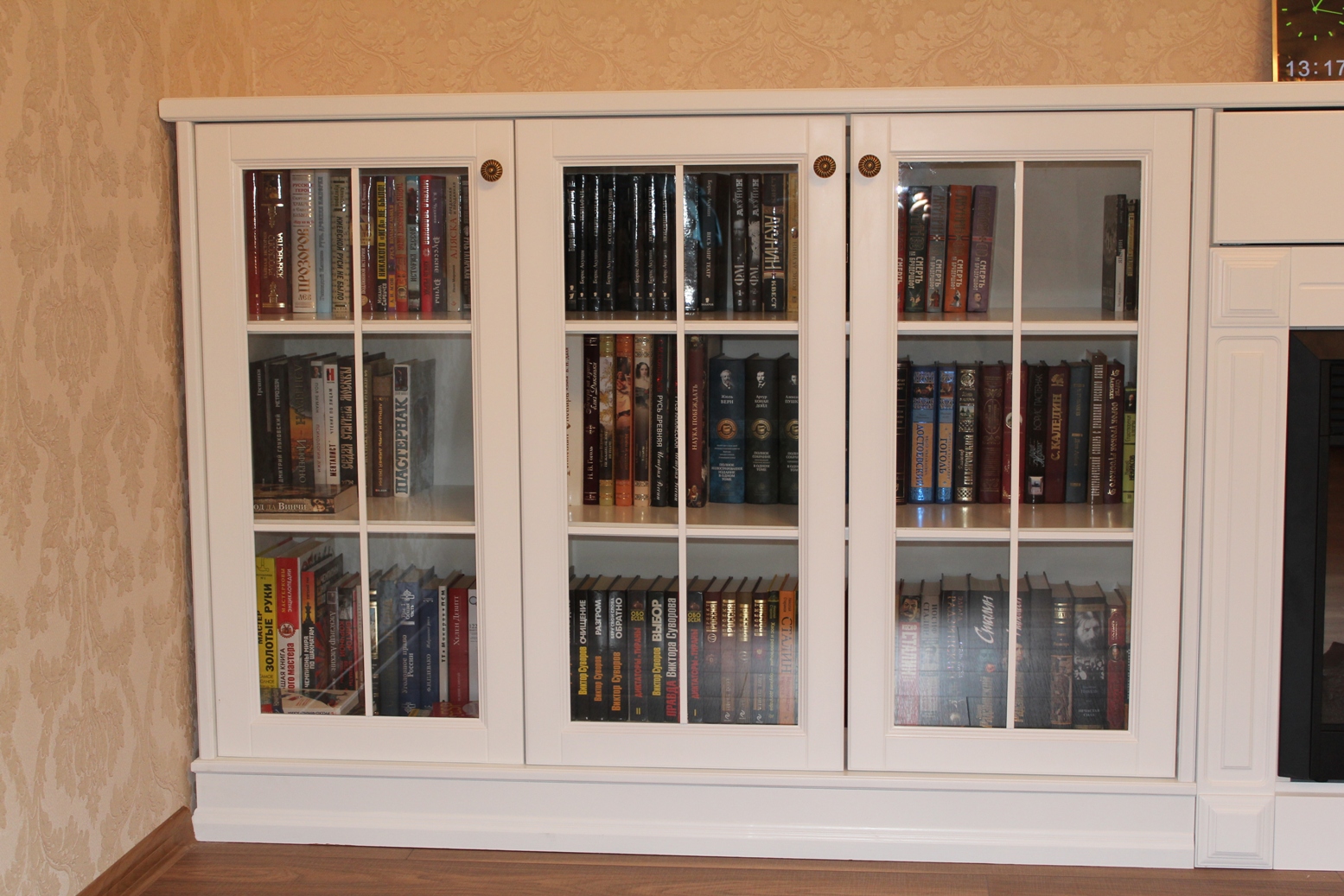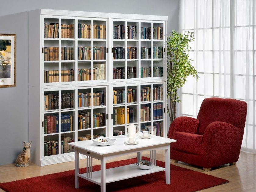 O vidro pode ser opaco ou transparente, o que facilita a localização do livro certo. Muitas vezes você pode encontrar vidro colorido, colorido ou mostruário. Em modelos com óculos transparentes, você pode colocar apenas uma coleção bonita, com uma condição satisfatória das raízes.