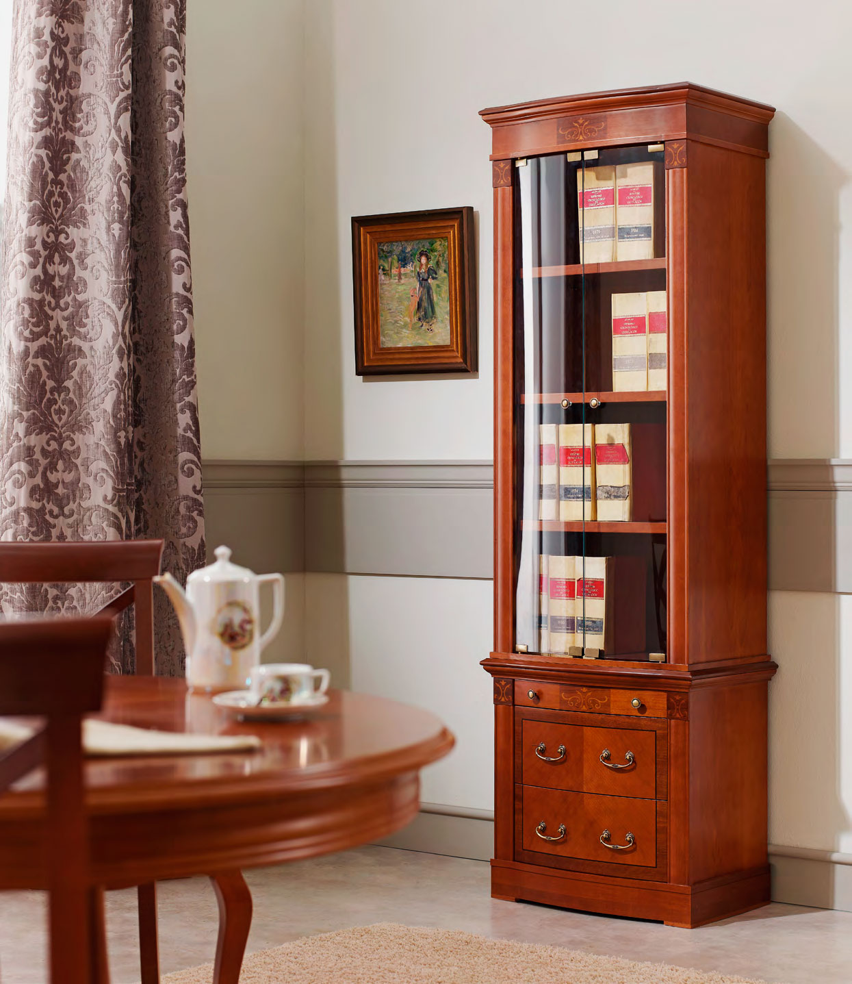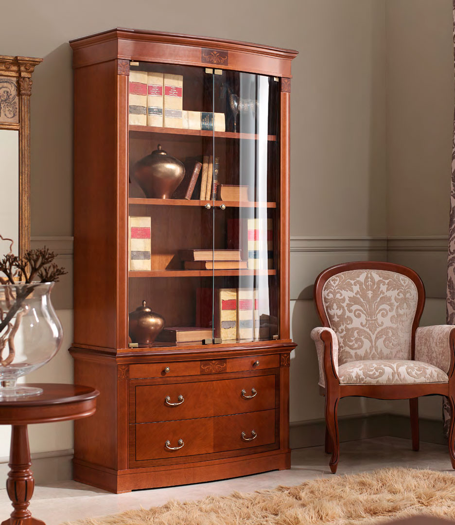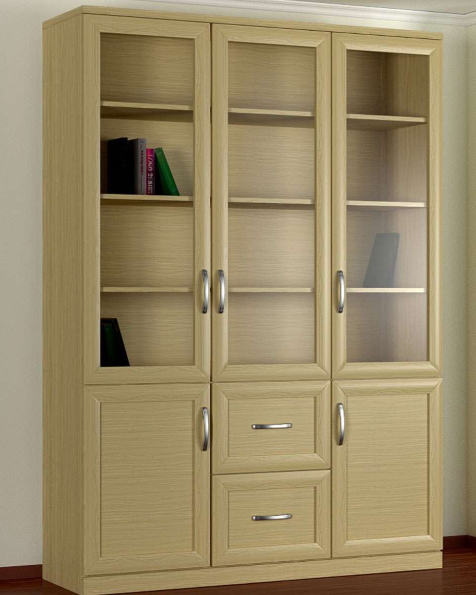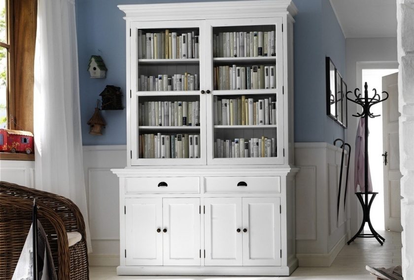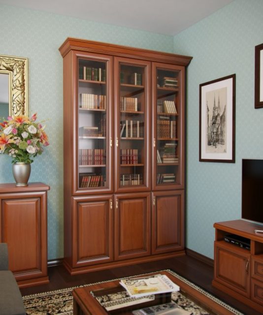 Armários padrão consistem em duas partes. O topo tem vidros. Eles colocam livros bonitos e caros que exigem proteção especial. A parte inferior é geralmente sem vidro. Contém as instâncias usuais.