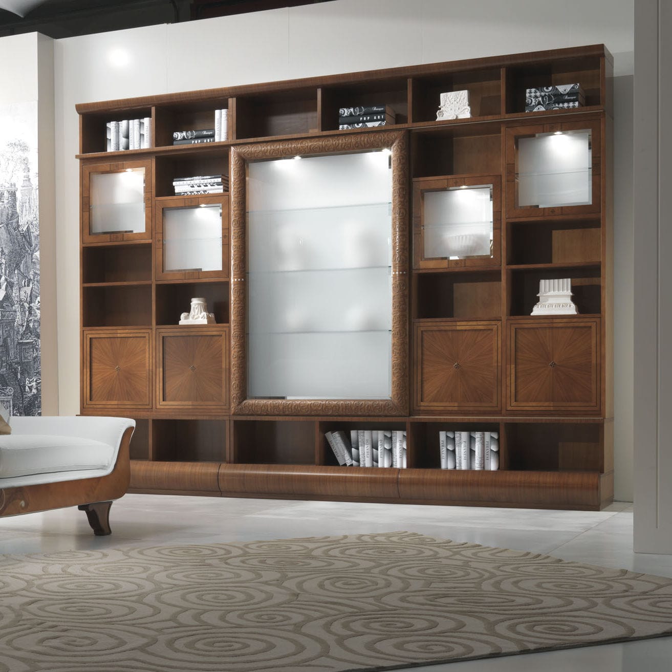O design da mobília deve estar de acordo com o design geral da sala. Uma estante clássica é considerada universal para qualquer estilo interior. É feito de valiosa madeira natural, que é decorada com: