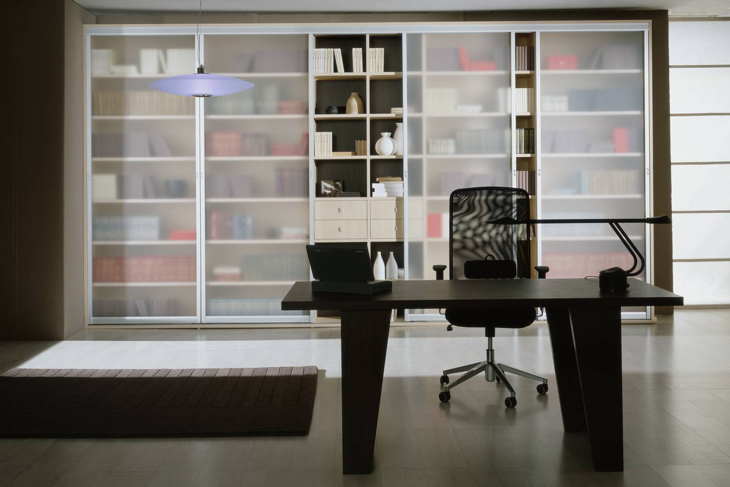 No mercado de móveis, surgiram modelos combinando uma área de trabalho, uma mesa e um sistema de armazenamento. Armários que cobrem toda a parede servem como isolamento adicional de som e calor.