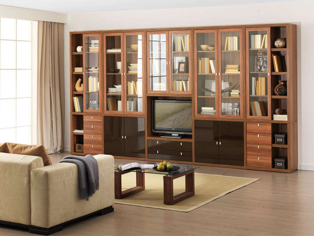 Móveis com portas de vidro em uma versão modular podem ser alternados com diferentes itens internos. Ele se encaixa perfeitamente na parede, ocupando a maior parte. Alguns sistemas modulares possuem grandes gavetas na parte inferior, nas quais você pode armazenar livros de tamanho personalizado.