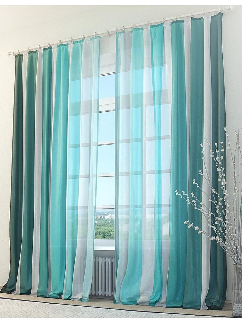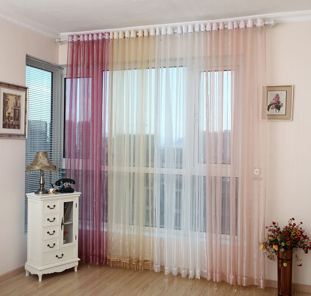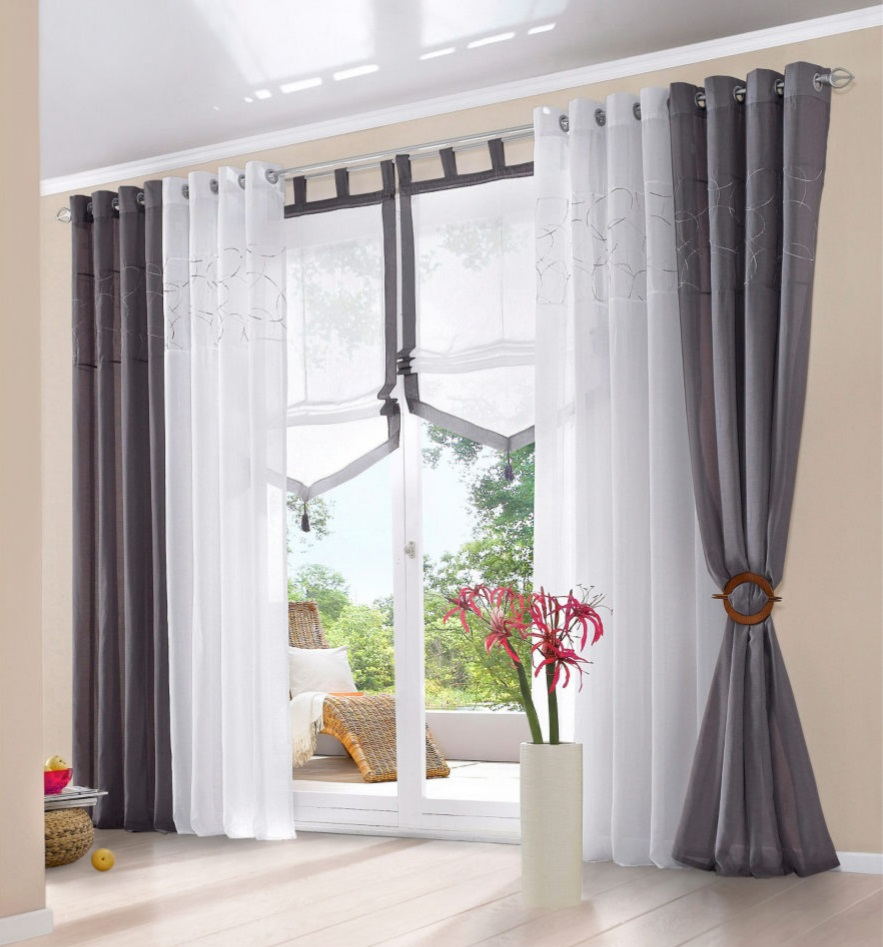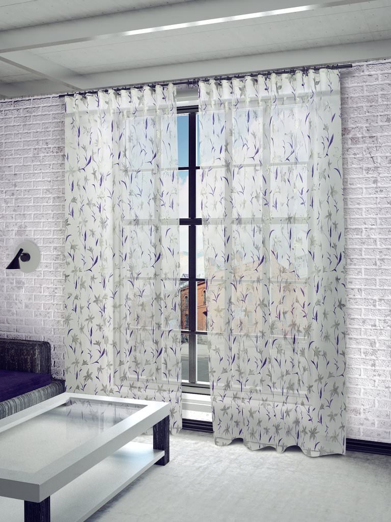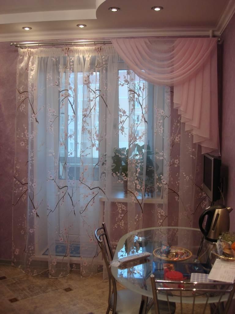 Muitas vezes, no interior, combinam uma organza monofônica transparente e um véu com um padrão de cores de tonalidade semelhante. No início, a cor monocromática é pendurada na janela e transparente com um padrão no topo. Acontece efeito volumétrico muito bonito de fumaça.