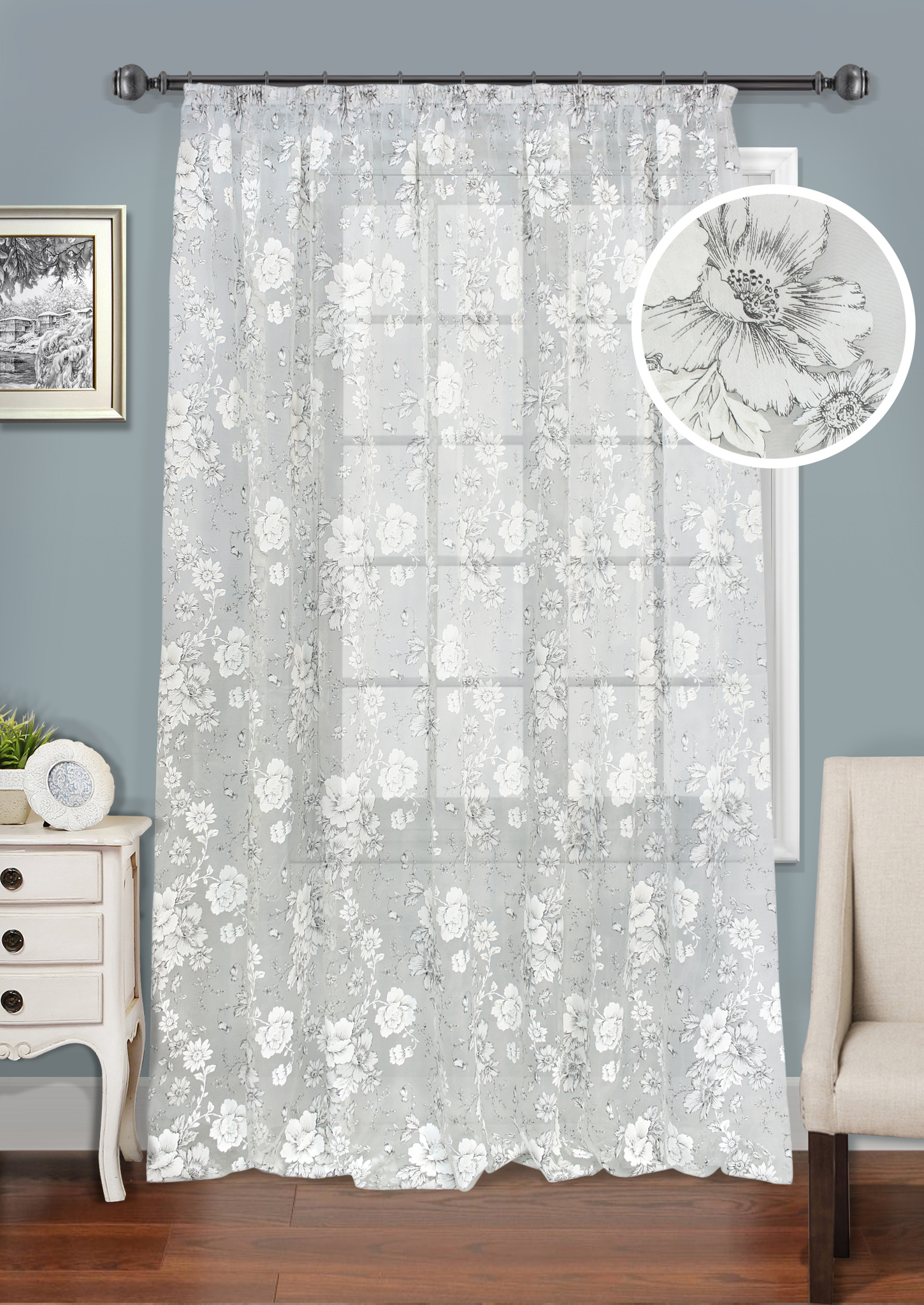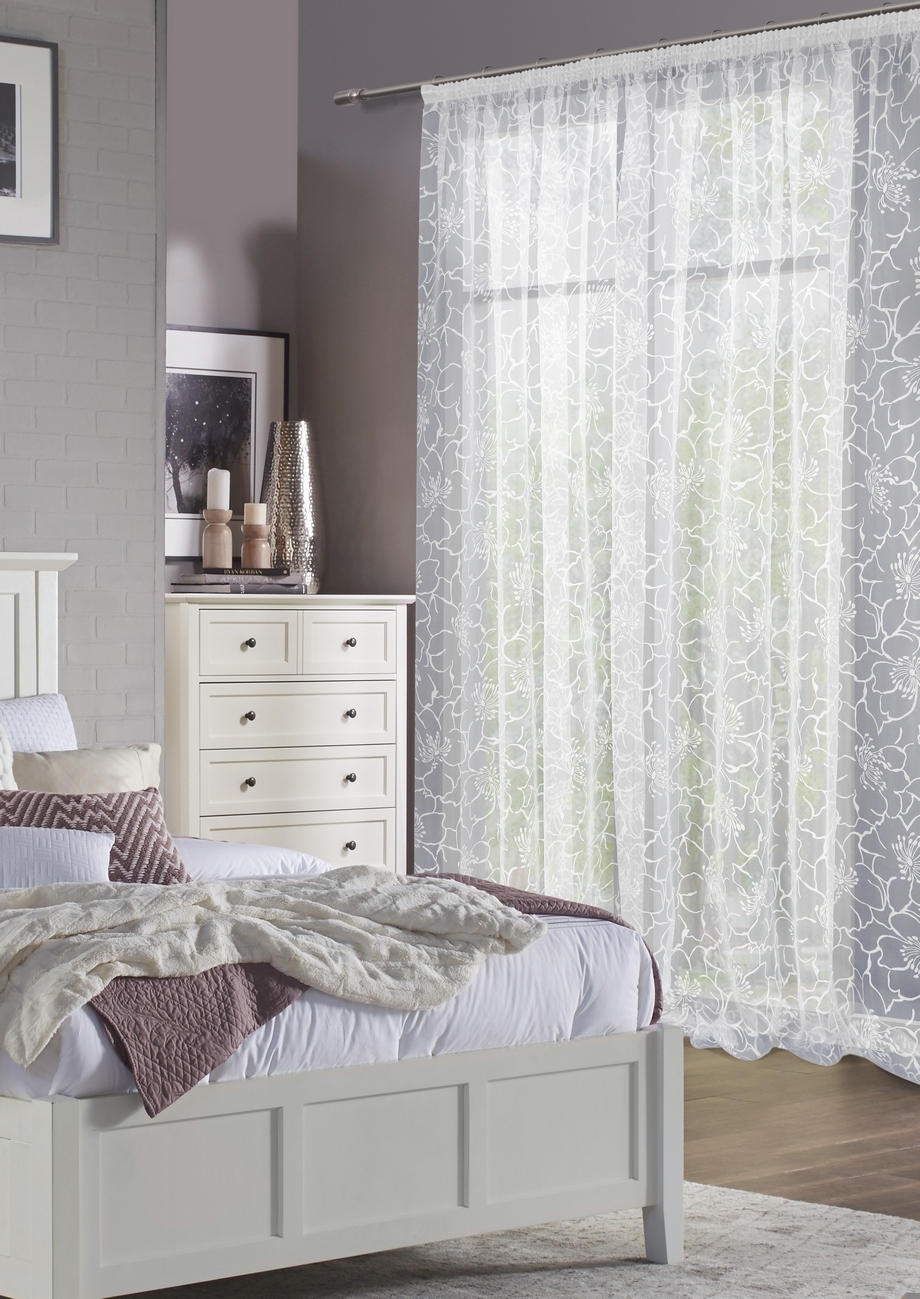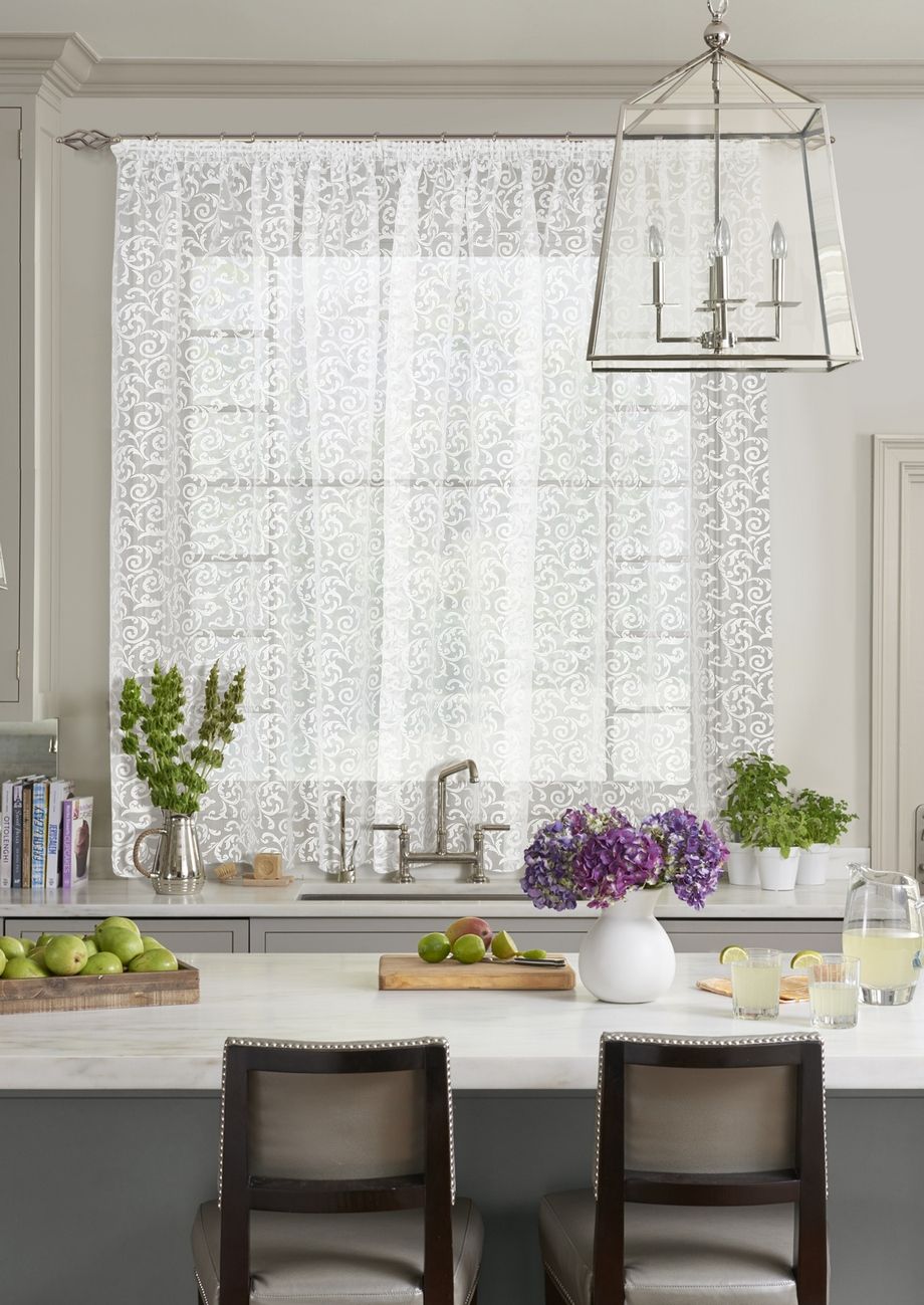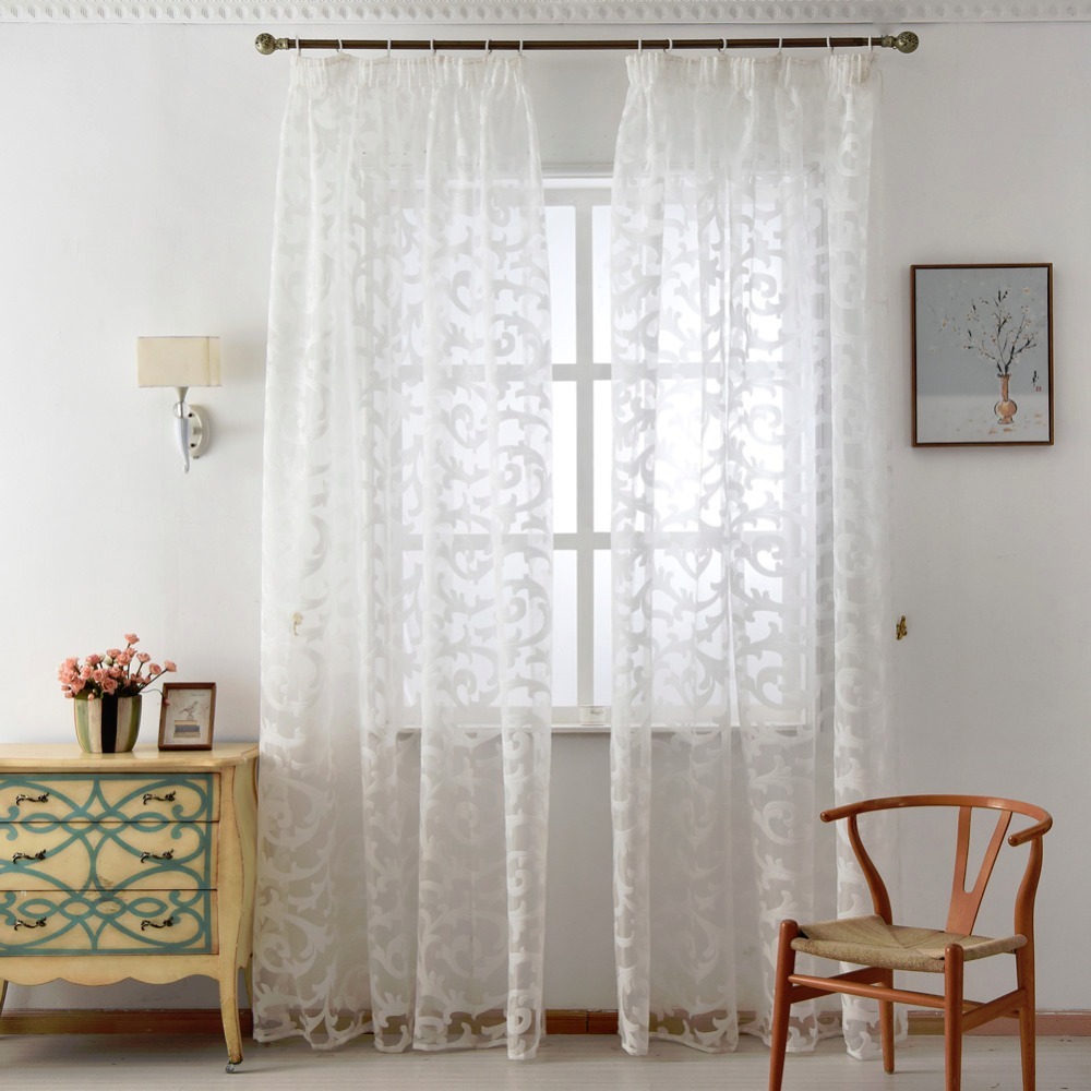 Imagem romântica da sala dará uma cortina branca translúcida, caindo no chão em uma nuvem sem peso. Ele irá criar um efeito de véu de luz na sua janela.. Ao contrário da organza clássica, o véu é mais macio e se assemelha a uma malha fina. Na maioria das vezes é tons pastel brancos ou delicados. Para o véu de crianças use uma impressão neutra.