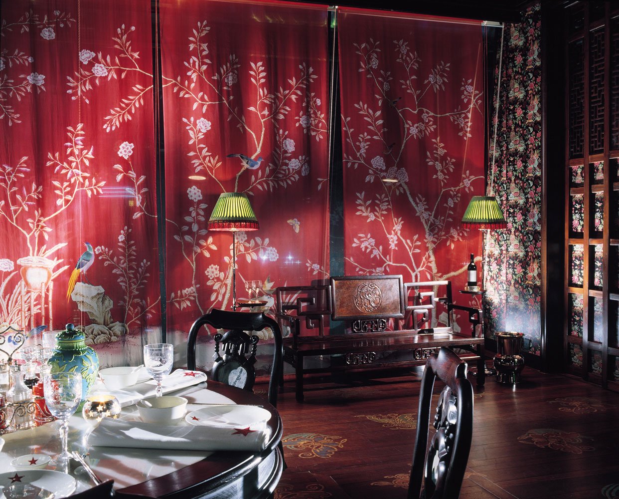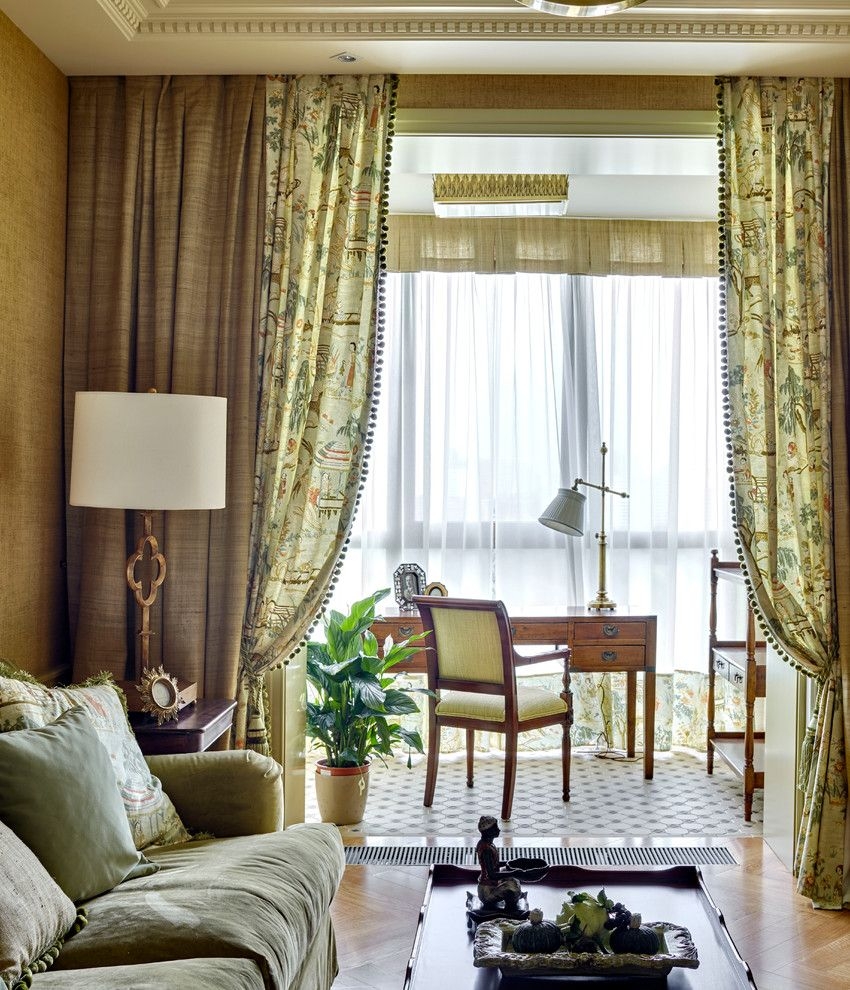 Muitas vezes, tecidos caros para cortinas com um padrão clássico são feitos em organza. Acrescenta leveza e leveza do tecido.. Do lado parece que os cachos do padrão apenas pairam no ar.