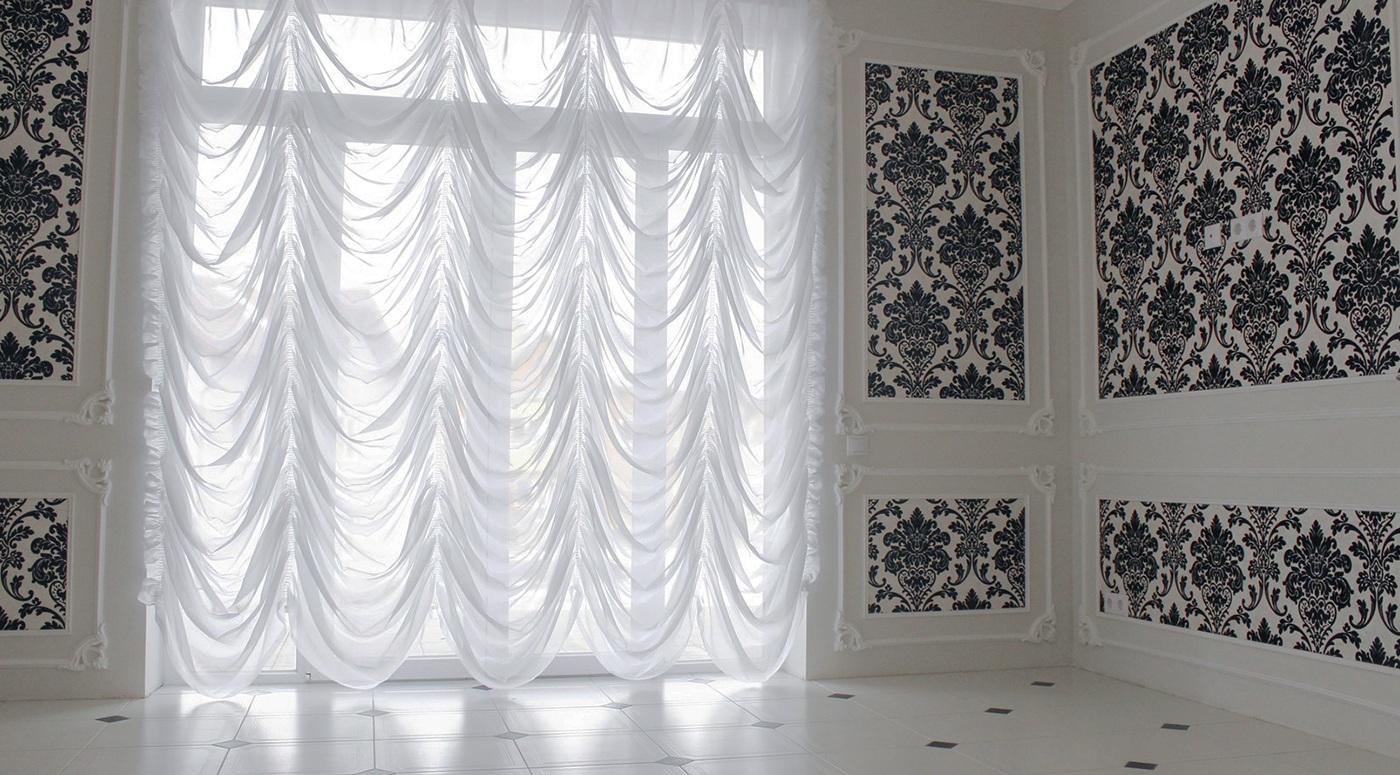 Escolhendo um tecido para janelas, você precisa considerar o estilo geral da sala e a cor do papel de parede. Se houver um padrão nas paredes, escolha um tule de uma cor, caso contrário, a sala parecerá empilhada.