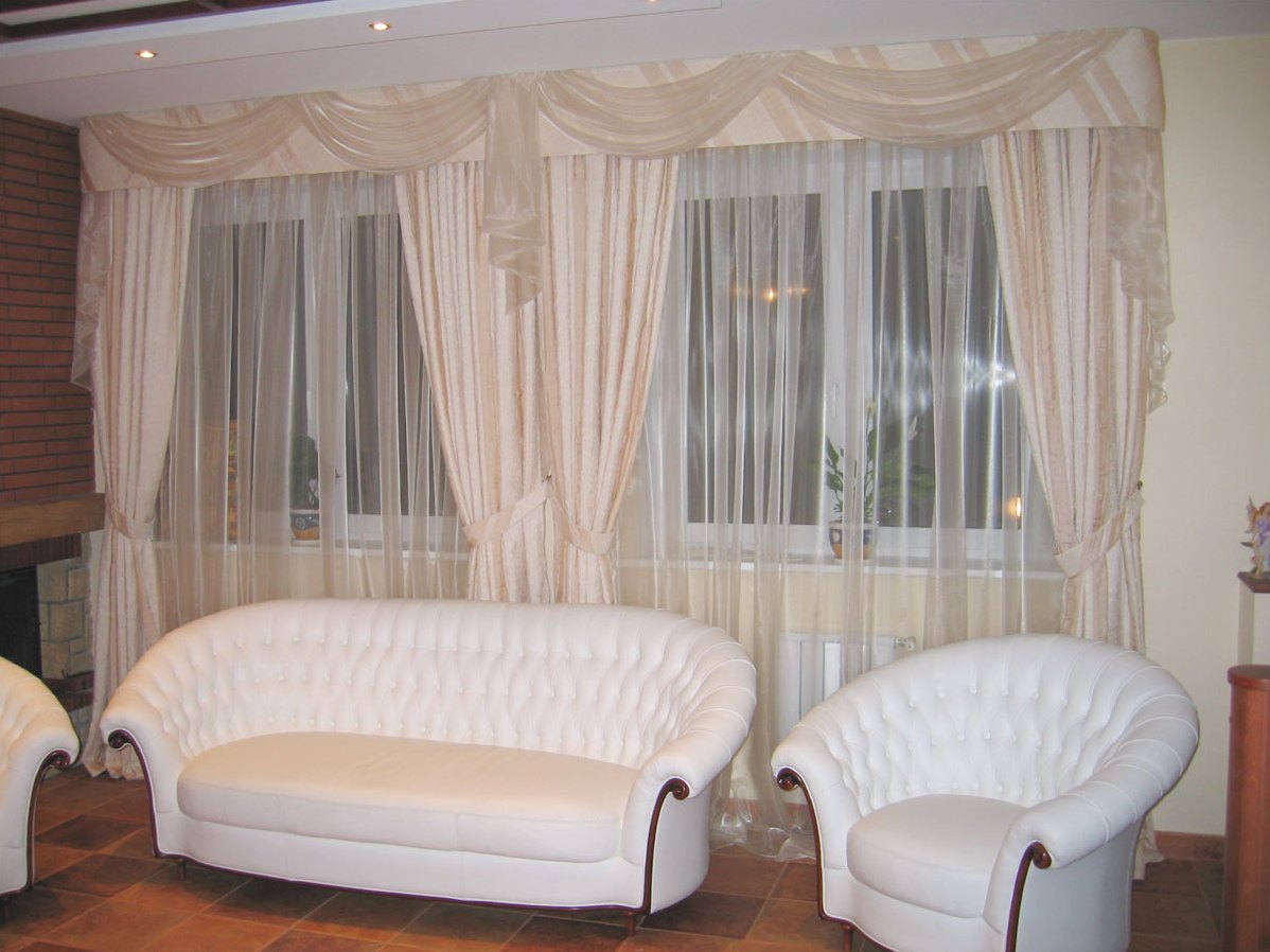 Cortinas para o salão sempre têm um estilo solene, mas não fantasioso. Eles devem ser fácil e rapidamente apagados (sempre estar limpo para a chegada dos convidados). Não feche a bela vista da janela. Organza se encaixa perfeitamente todas essas características.