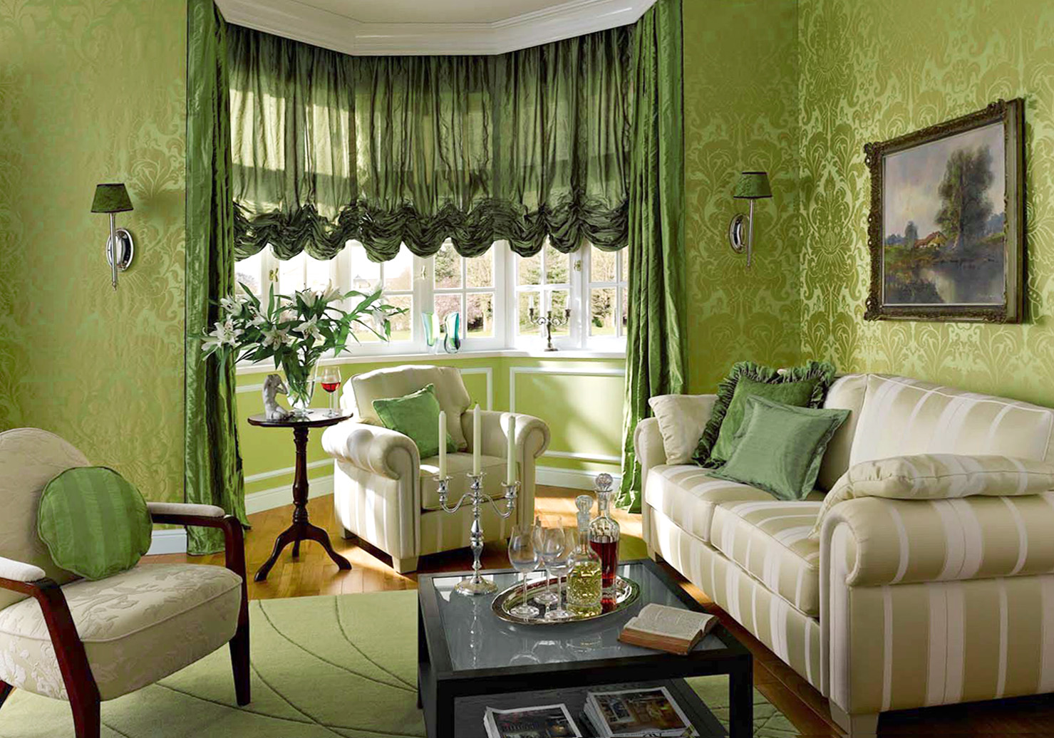 A cor verde no interior ajuda a relaxar, restaurar o equilíbrio emocional. Esta é a cor do relaxamento, harmonia espiritual. Uma variedade de tons fazem cortinas verdes universais, eles são adequados para qualquer estilo.