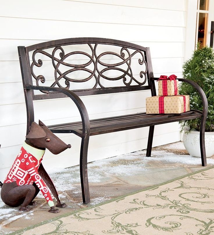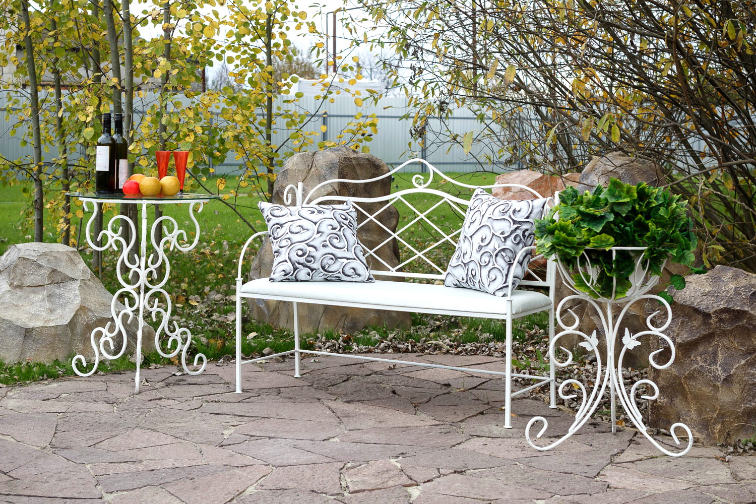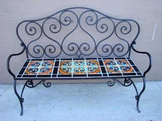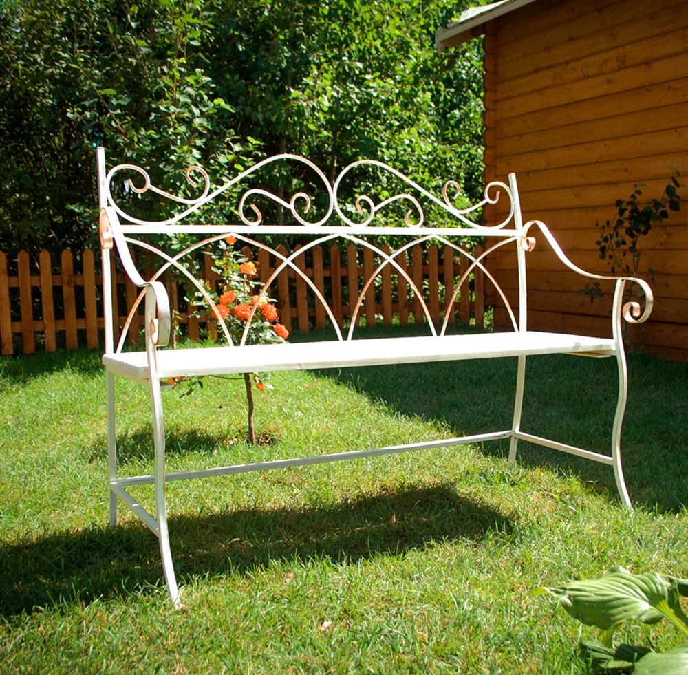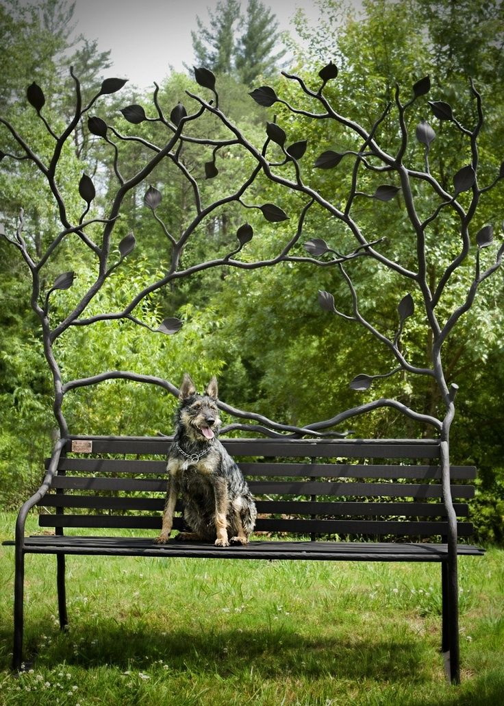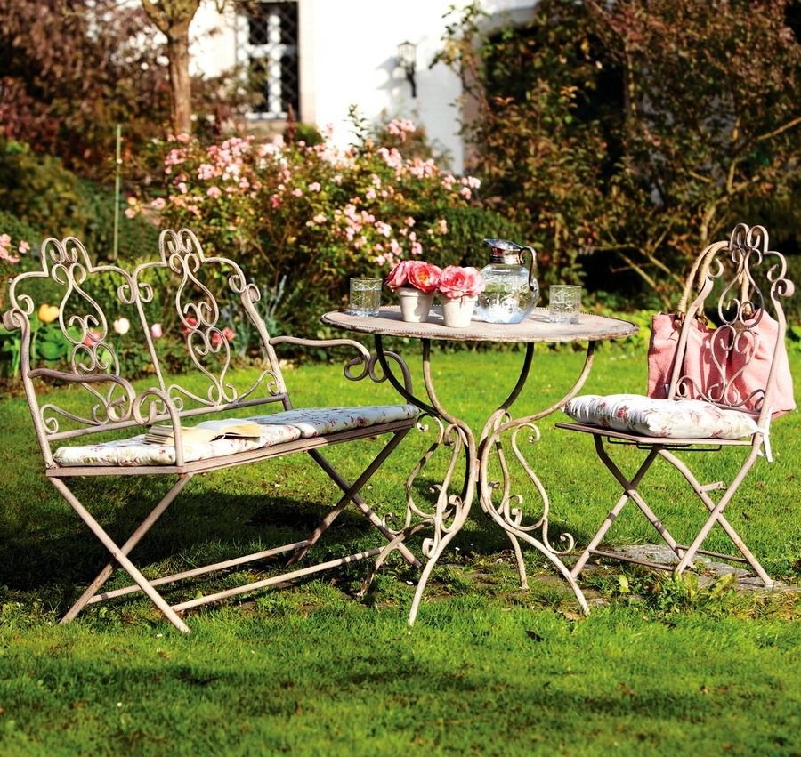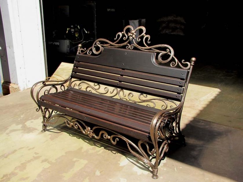 - Projetos de jardim - Bancadas a céu aberto com elementos em ferro forjado. Eles complementam perfeitamente o design geral da paisagem, estabelecendo o espaço funcional.