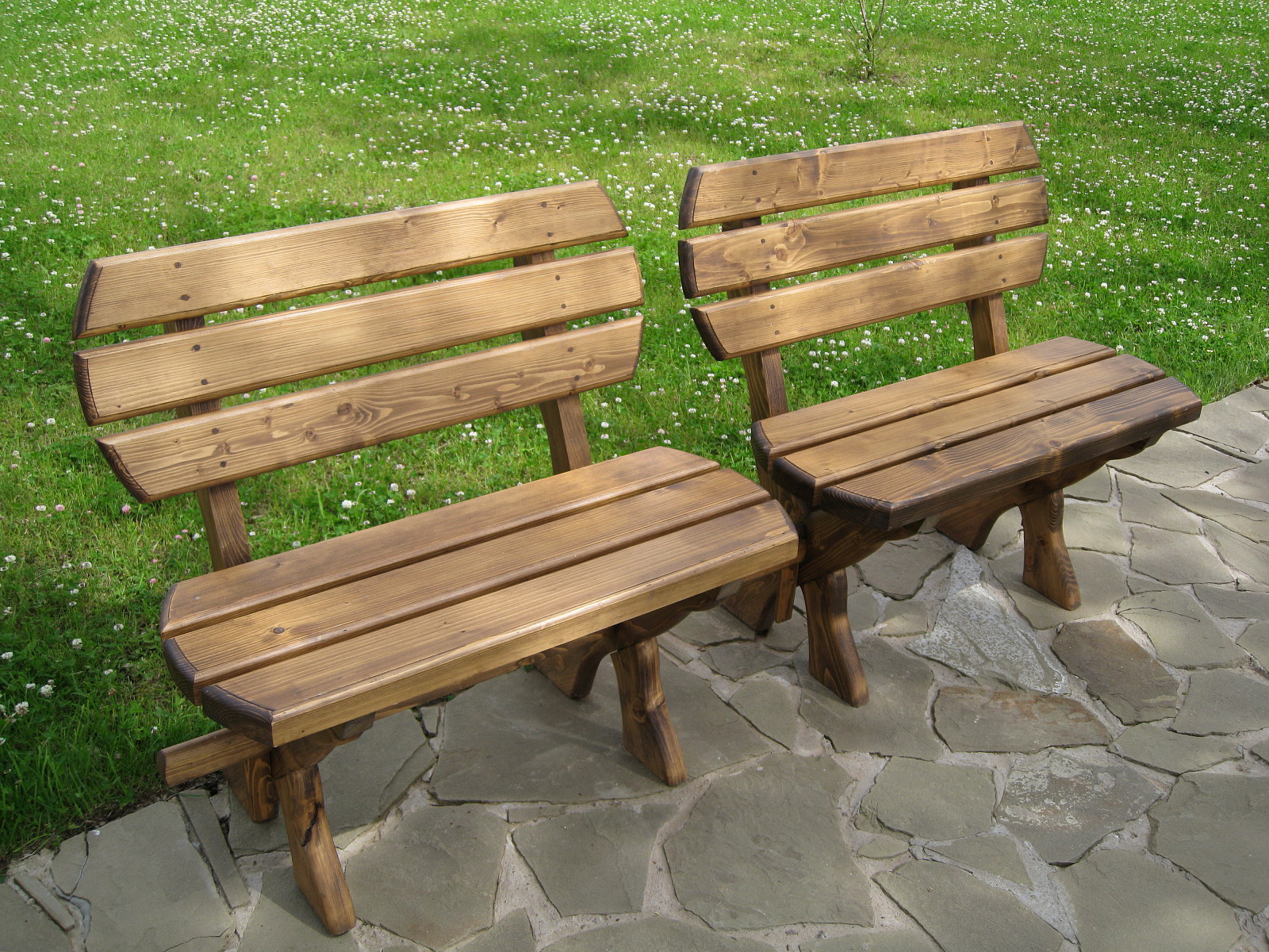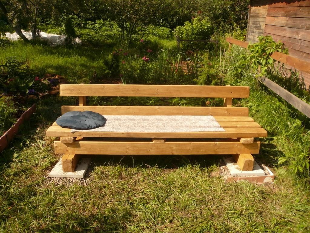 - madeira - projetos duráveis e confiáveis. Devido à estrutura densa da árvore não absorve umidade, sob a ação da radiação solar não racha. Para a fabricação de móveis usados madeira coníferas, álamo tremedor, amieiro, carvalho. Tais modelos podem ter um padrão esculpido nas pernas, braços ou cabeceira.A madeira é pintada com uma laca tingida para preservar a textura do material;