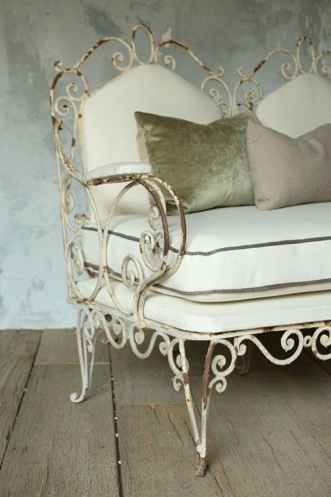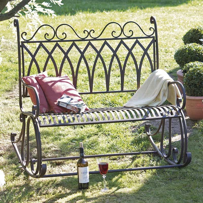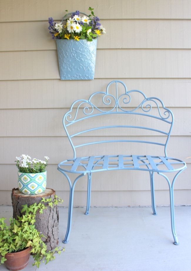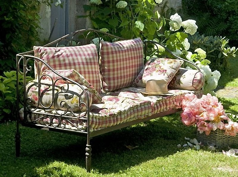 No entanto, para criar móveis de jardim no jardim, você pode usar objetos de metal antigos, por exemplo, a cama. Para construir uma peça de mobiliário, você precisa deixar a estrutura da cama e com a ajuda de madeira para fazer o encosto do banco. Tais modelos darão aconchego e exclusividade ao seu estilo.