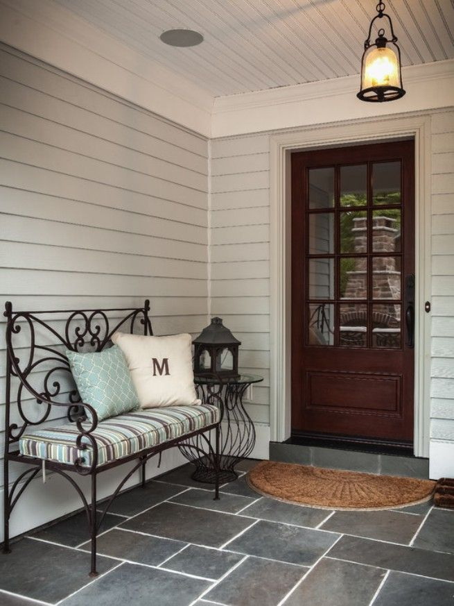 Mandril sem móveis confortáveis é inútil. Afinal, deve haver um lugar para descansar. Pode ser equipado com bancos, cadeiras, poltronas ou banco de transformação. Está localizado dependendo da área, características estruturais. Os móveis de ferro forjado feitos de madeira e metal, bem como estruturas totalmente de madeira, parecem atraentes. Dependendo do estilo da sala, você pode escolher as lojas: