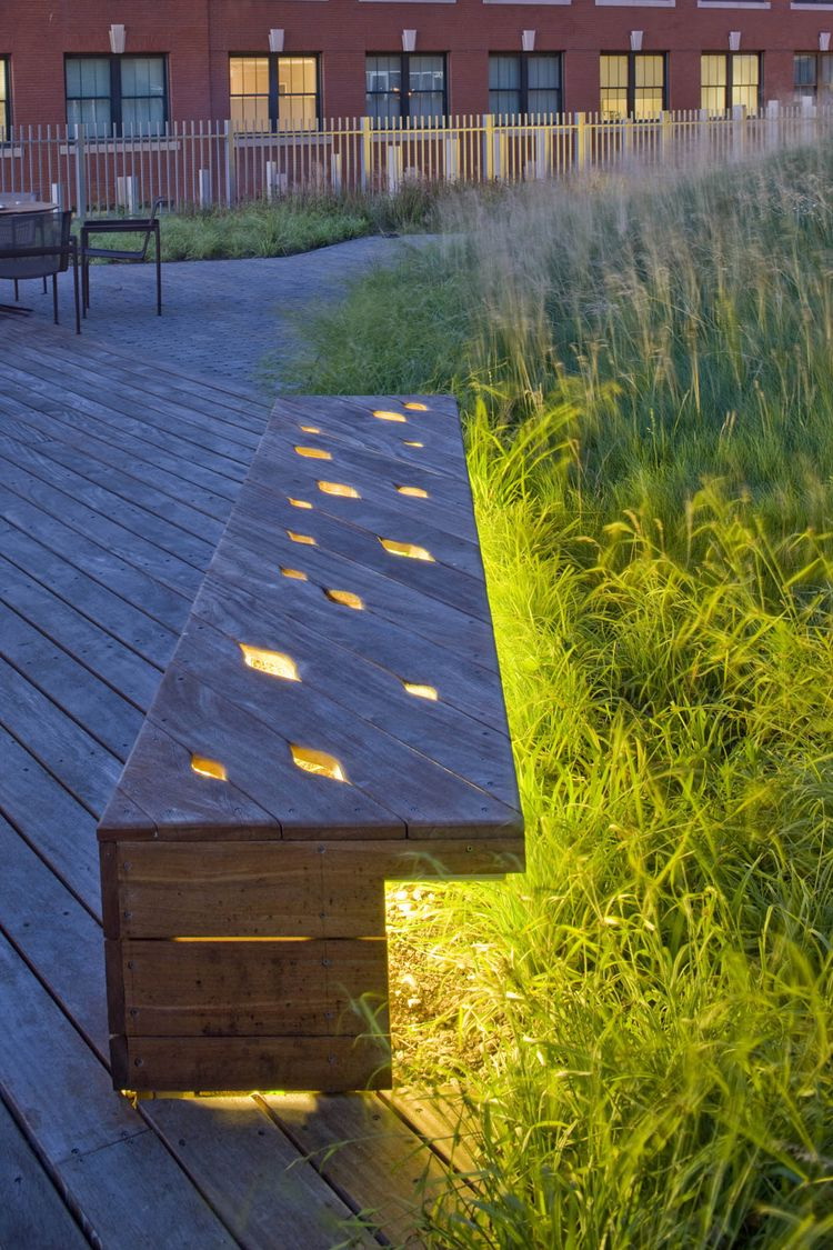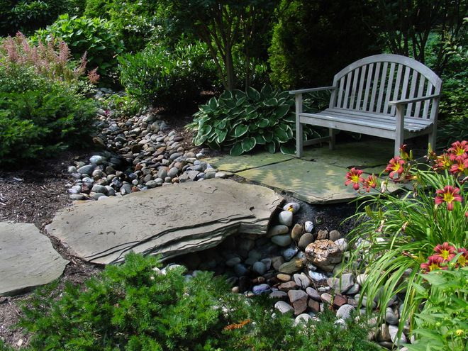 - áreas de paisagem. Ao criar estilo no site preserva a beleza natural da vegetação Cada elemento, por exemplo, um obstáculo ou um ramo rebaixado, não é retraído, mas é jogado para cima com a ajuda de vários elementos decorativos, incluindo bancos.