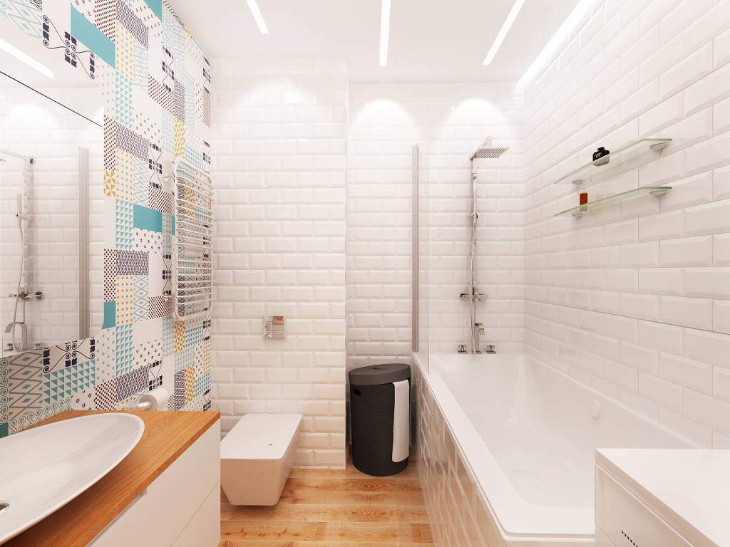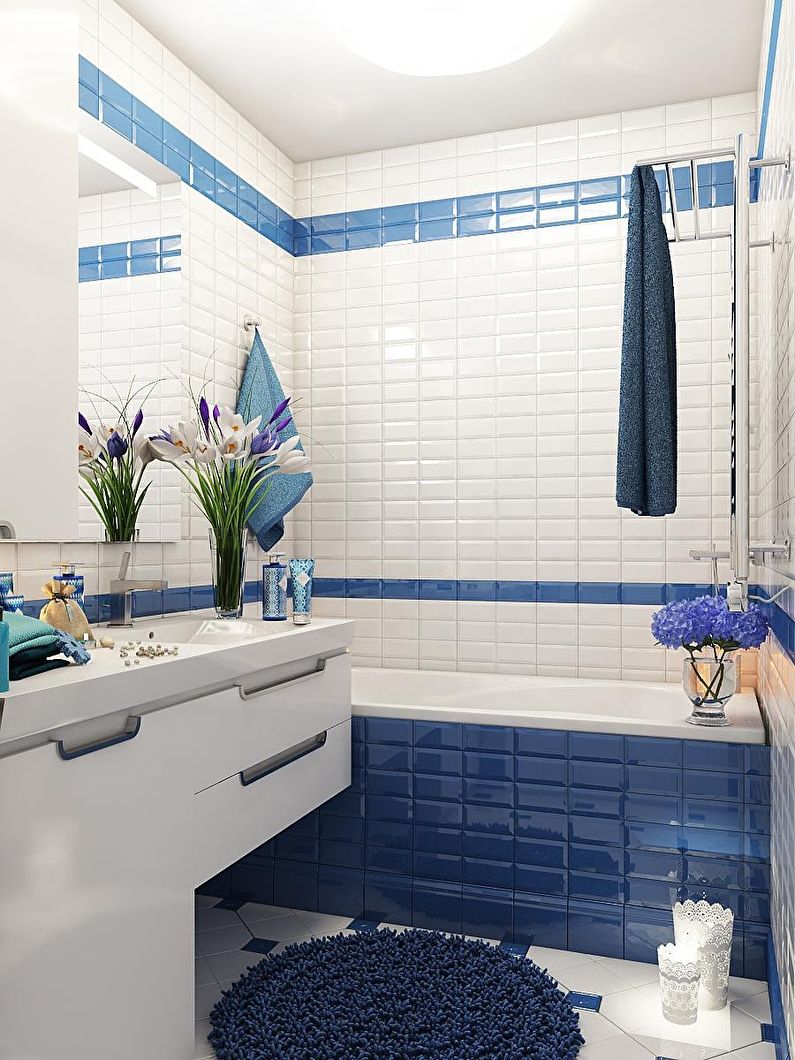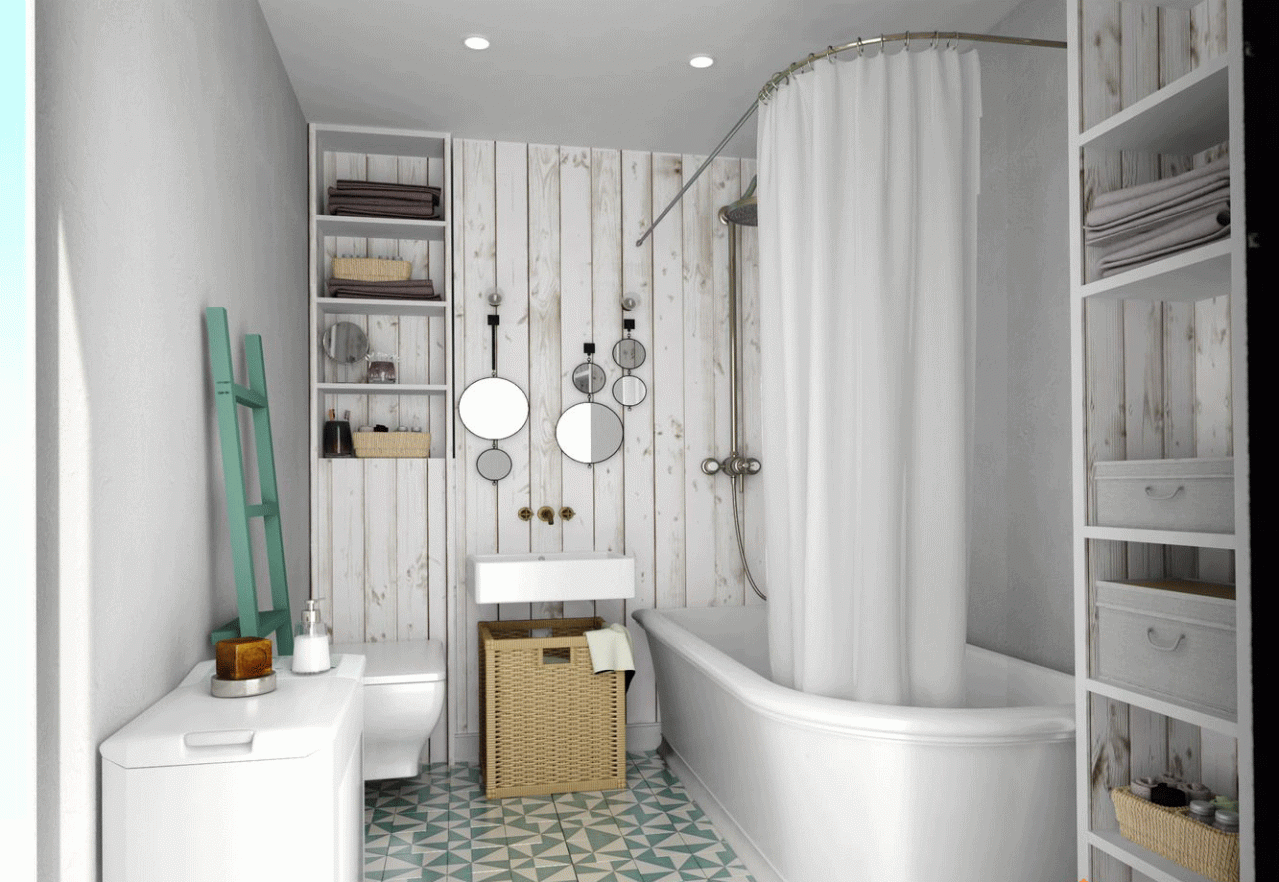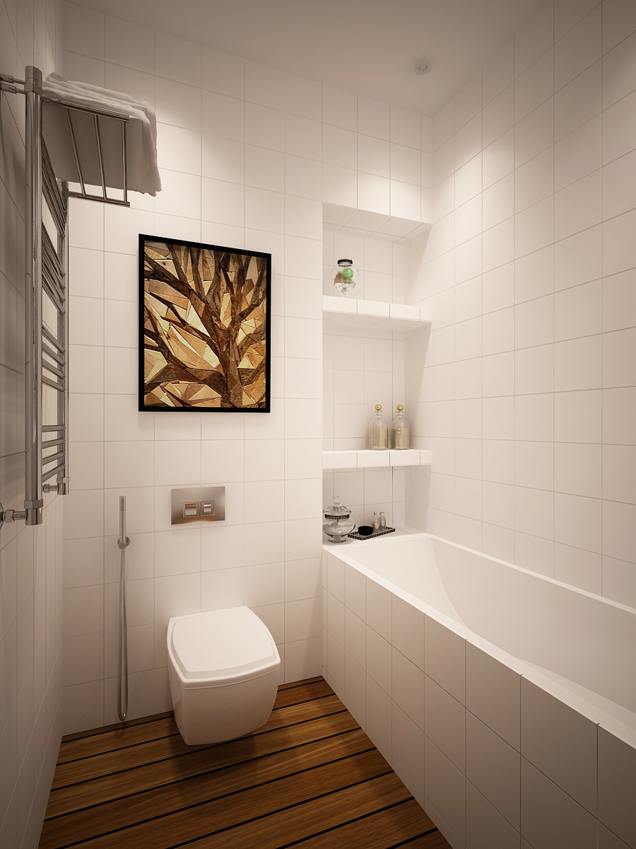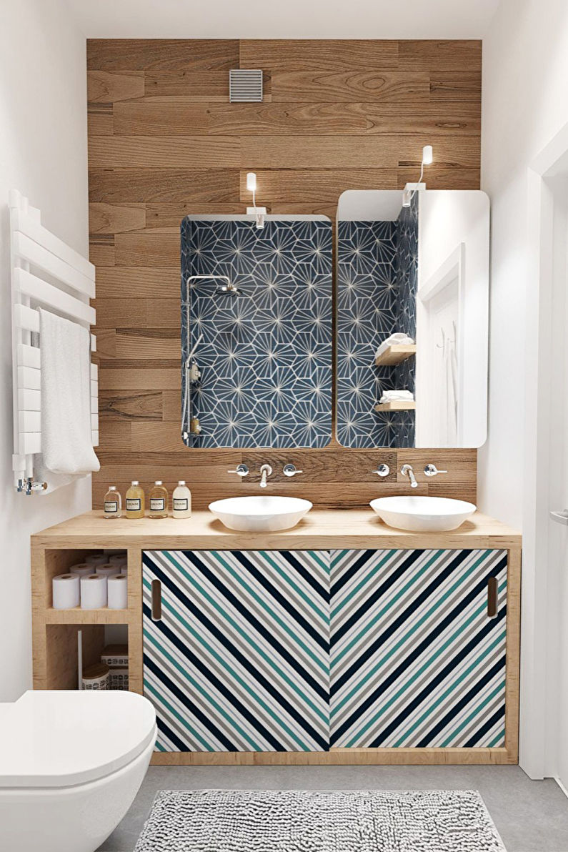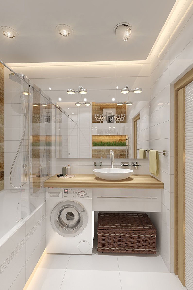 Paredes brilhantes, cerâmicas brancas para artigos sanitários (por exemplo, uma banheira, um lavatório e um vaso sanitário) e elementos de cor de madeira criam a impressão de espaço, ao qual o escândio é tratado com muito cuidado. No entanto, estes interiores harmoniosos coloridos precisam ser estimulados com cores como azul, verde ou rosa em tons pastel. Tons de cinza azul ou cinza também podem ser úteis.