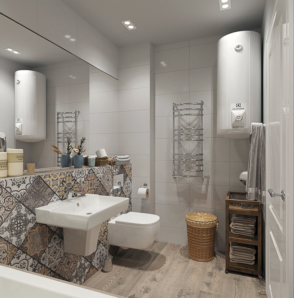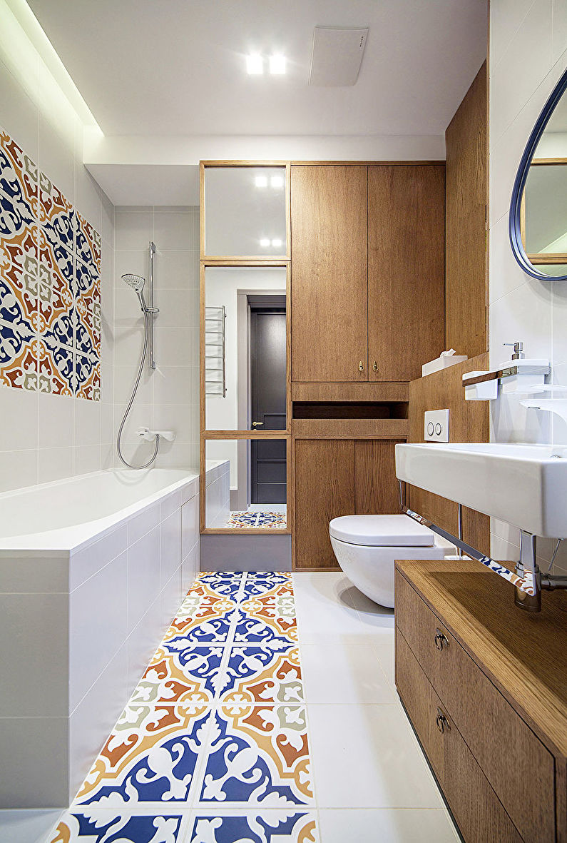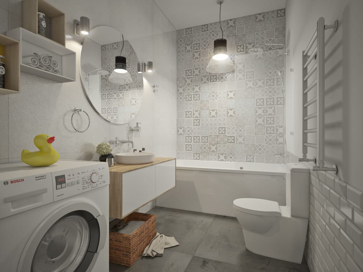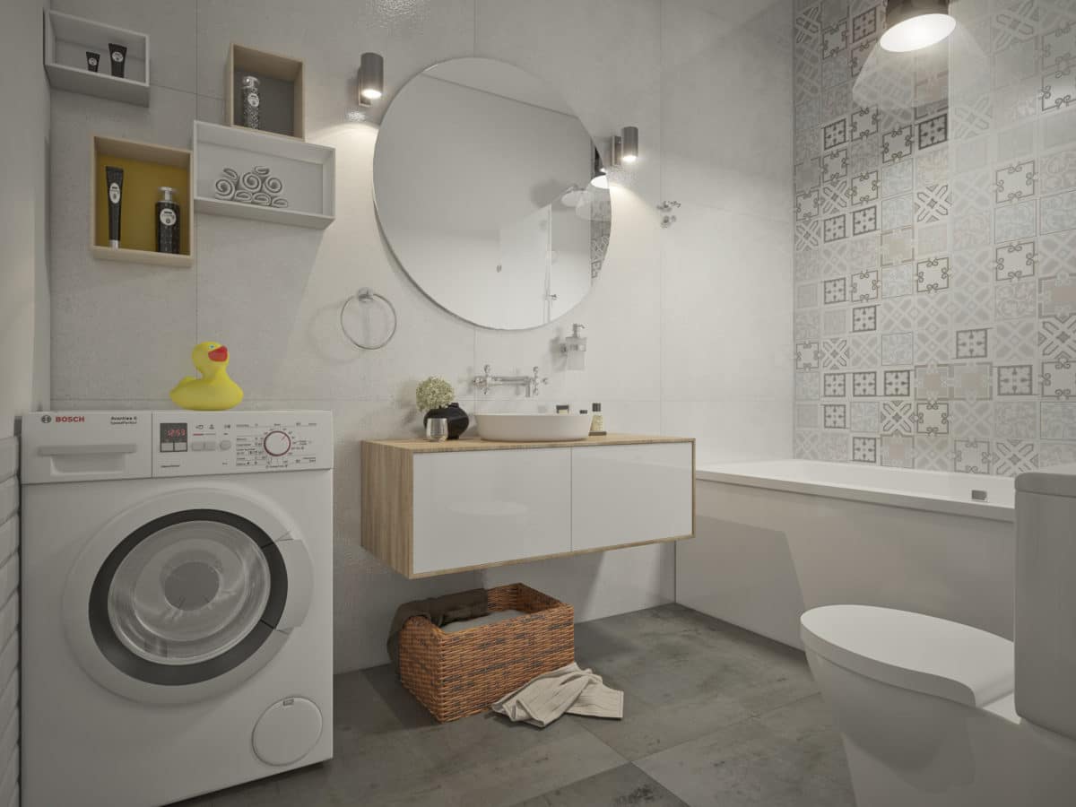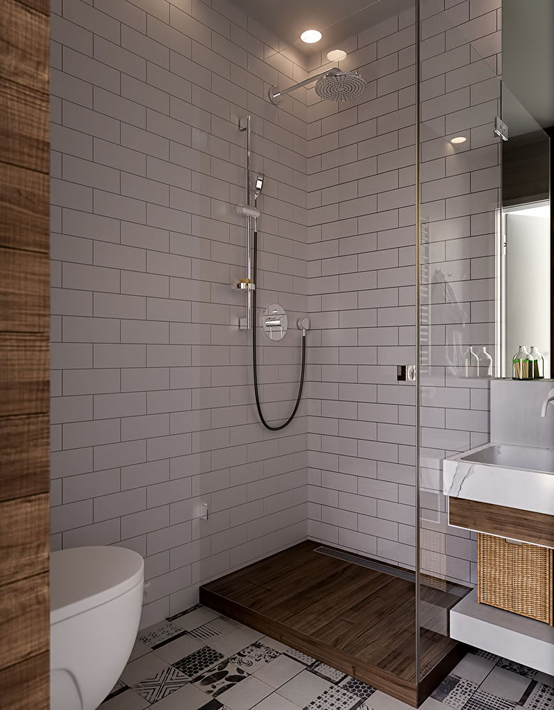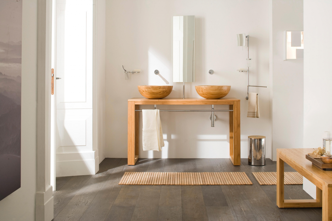 Paredes brilhantes, cerâmicas brancas para artigos sanitários (por exemplo, uma banheira, um lavatório e um vaso sanitário) e elementos de cor de madeira criam a impressão de espaço, ao qual o escândio é tratado com muito cuidado. No entanto, estes interiores harmoniosos coloridos precisam ser estimulados com cores como azul, verde ou rosa em tons pastel. Tons de cinza azul ou cinza também podem ser úteis.