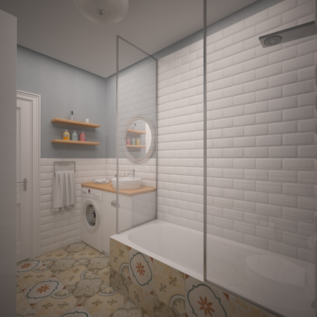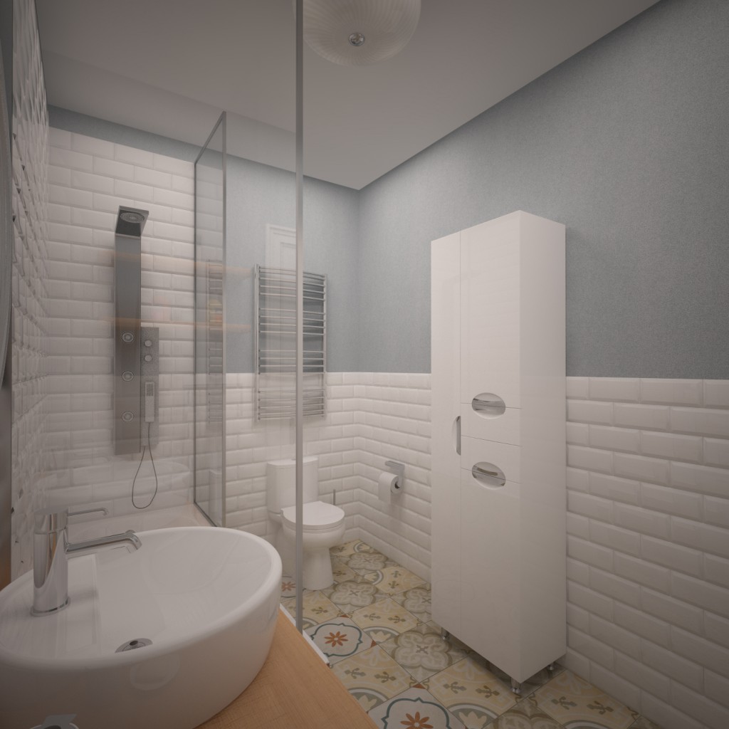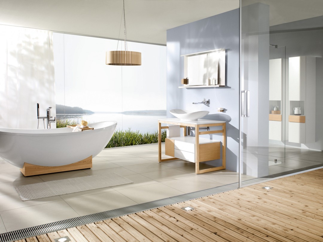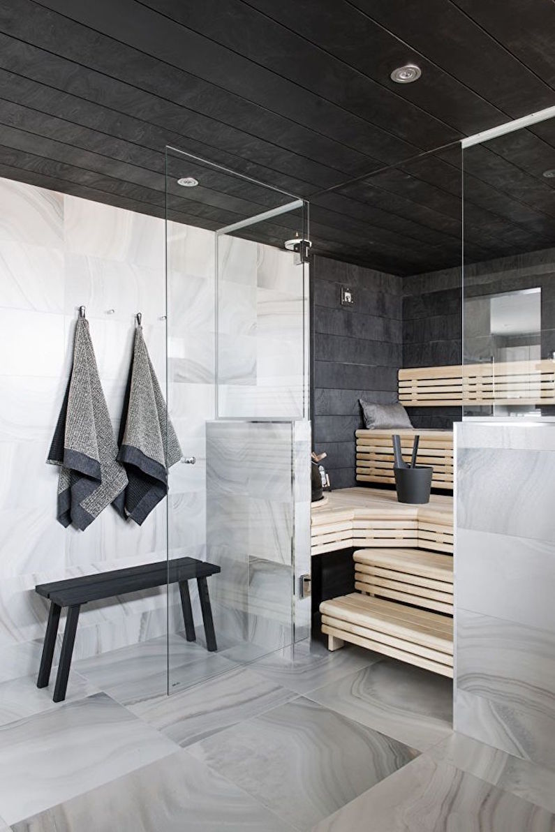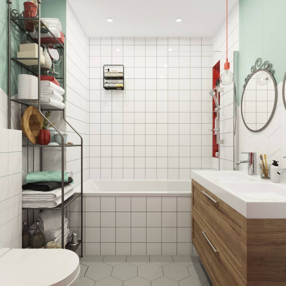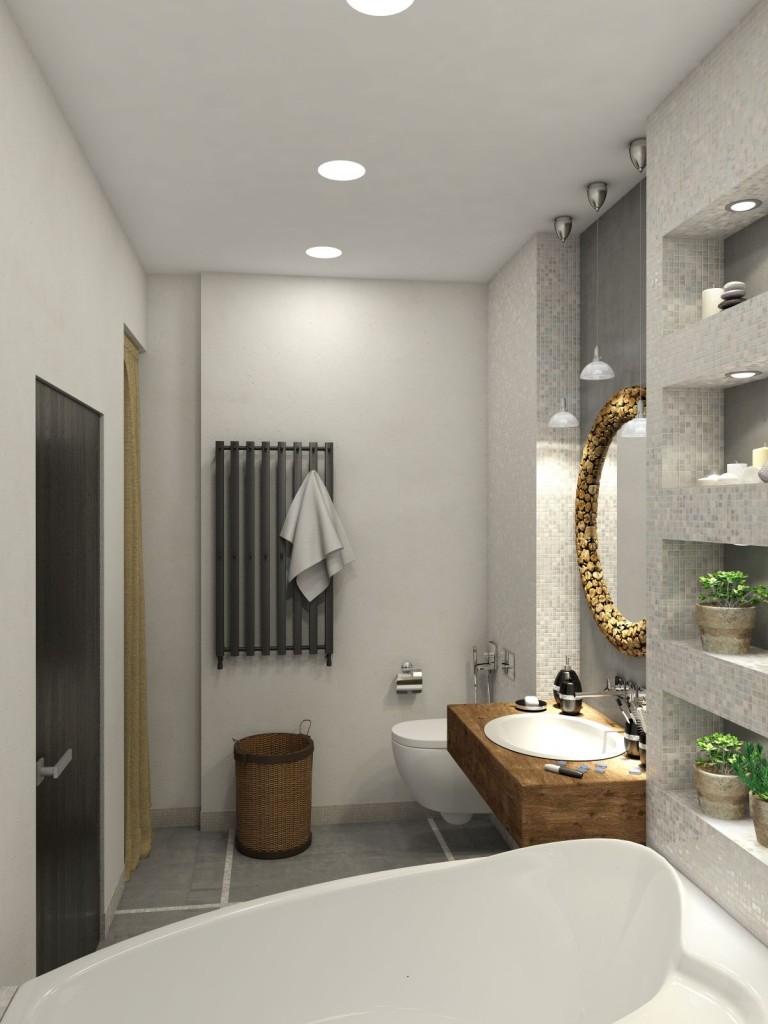 Paredes brilhantes, cerâmicas brancas para artigos sanitários (por exemplo, uma banheira, um lavatório e um vaso sanitário) e elementos de cor de madeira criam a impressão de espaço, ao qual o escândio é tratado com muito cuidado. No entanto, estes interiores harmoniosos coloridos precisam ser estimulados com cores como azul, verde ou rosa em tons pastel. Tons de cinza azul ou cinza também podem ser úteis.