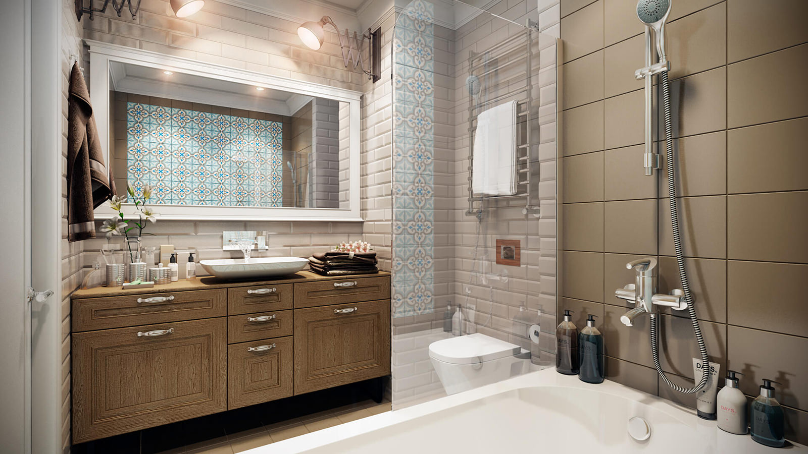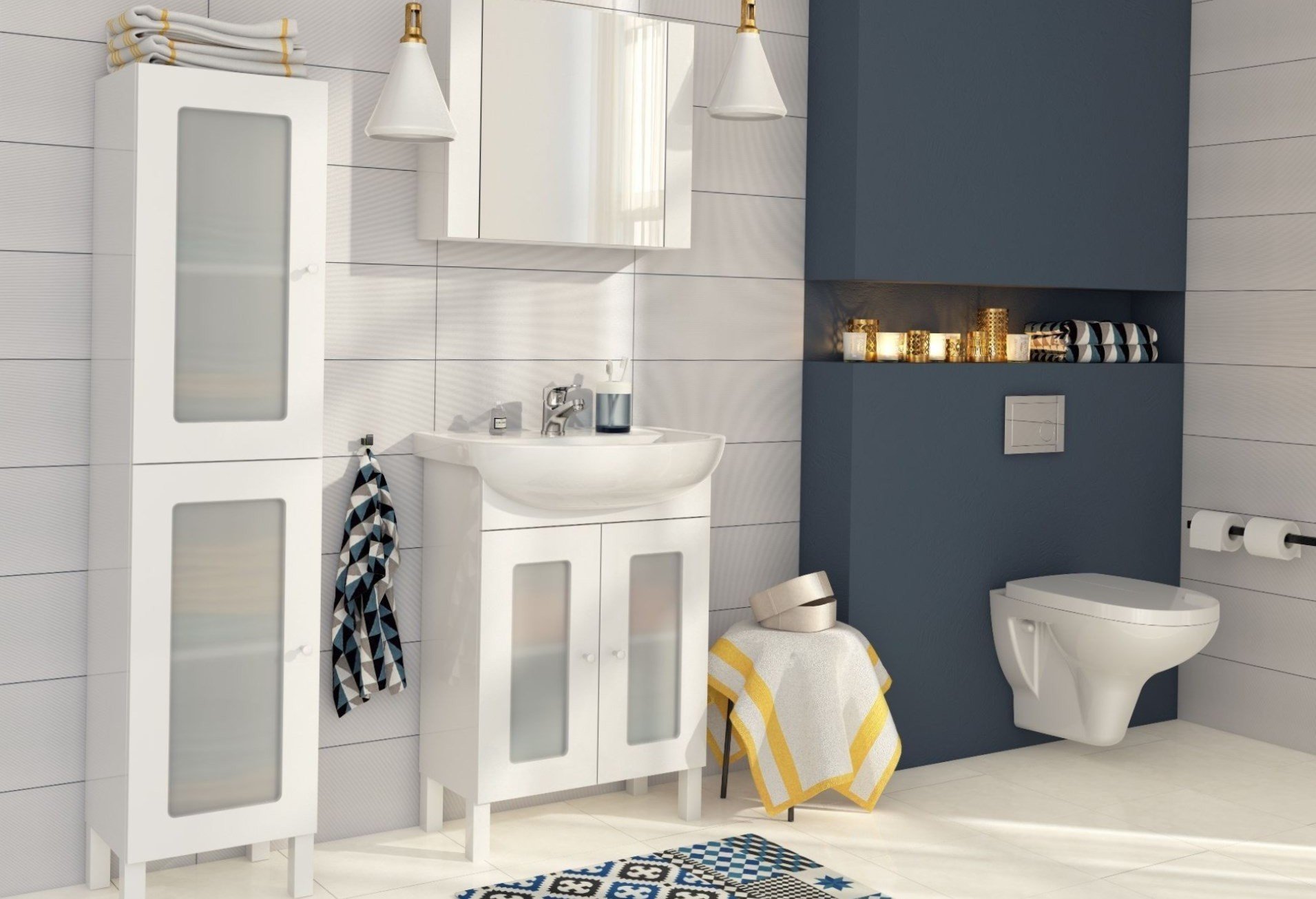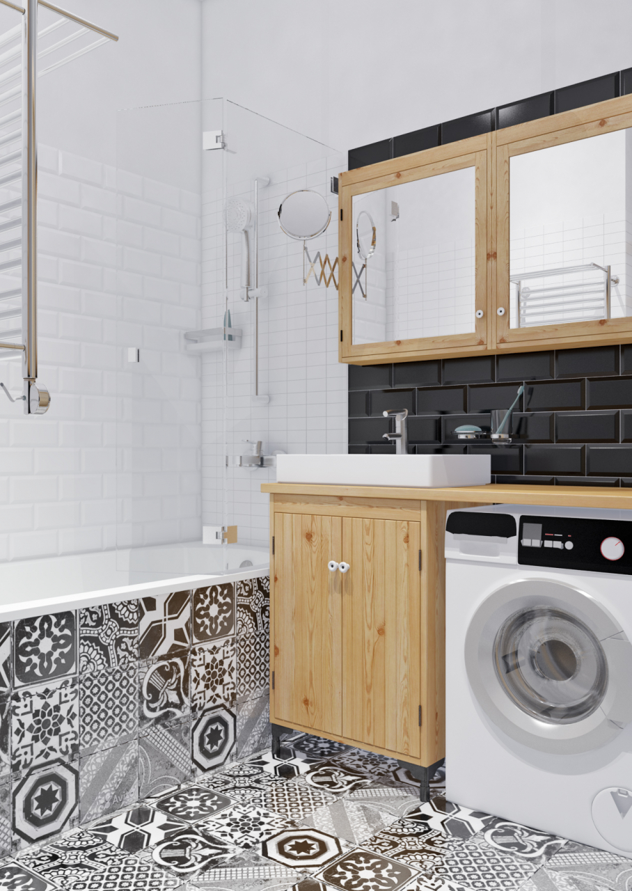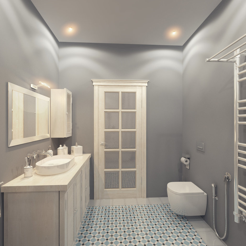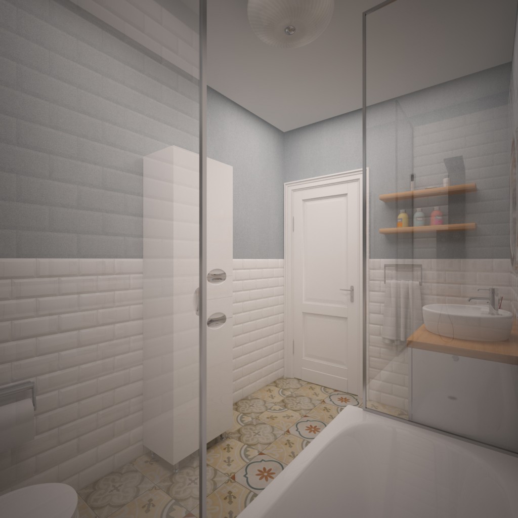 Paredes brilhantes, cerâmicas brancas para artigos sanitários (por exemplo, uma banheira, um lavatório e um vaso sanitário) e elementos de cor de madeira criam a impressão de espaço, ao qual o escândio é tratado com muito cuidado. No entanto, estes interiores harmoniosos coloridos precisam ser estimulados com cores como azul, verde ou rosa em tons pastel. Tons de cinza azul ou cinza também podem ser úteis.