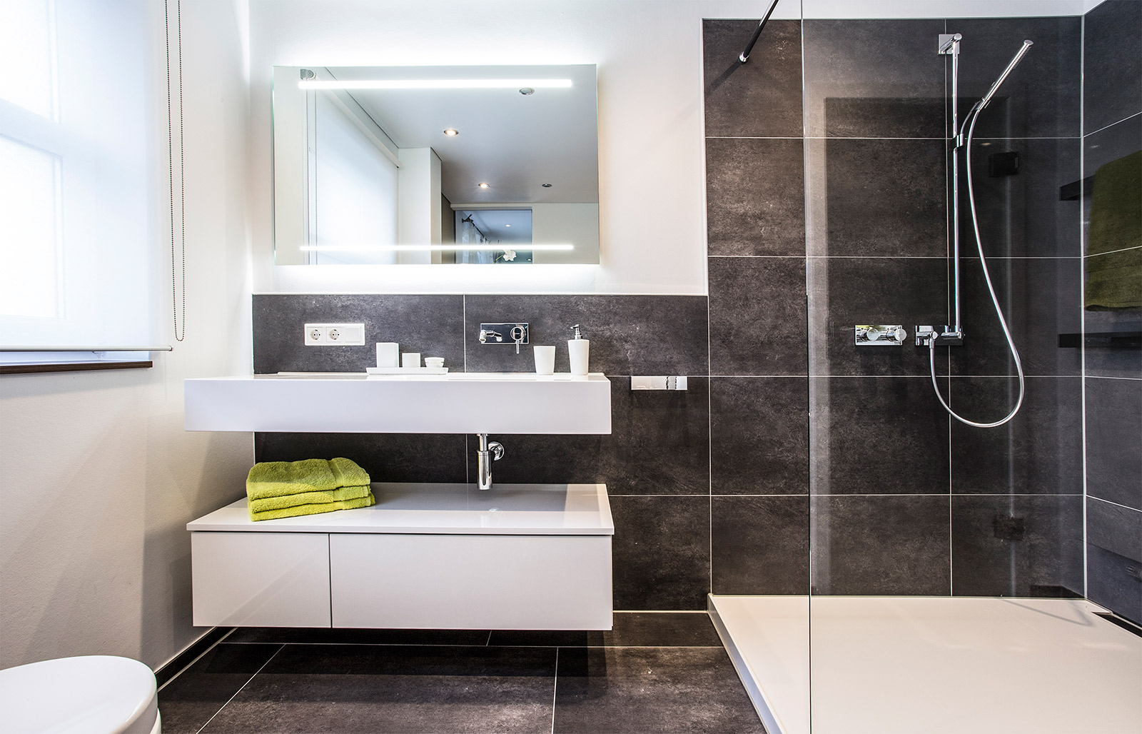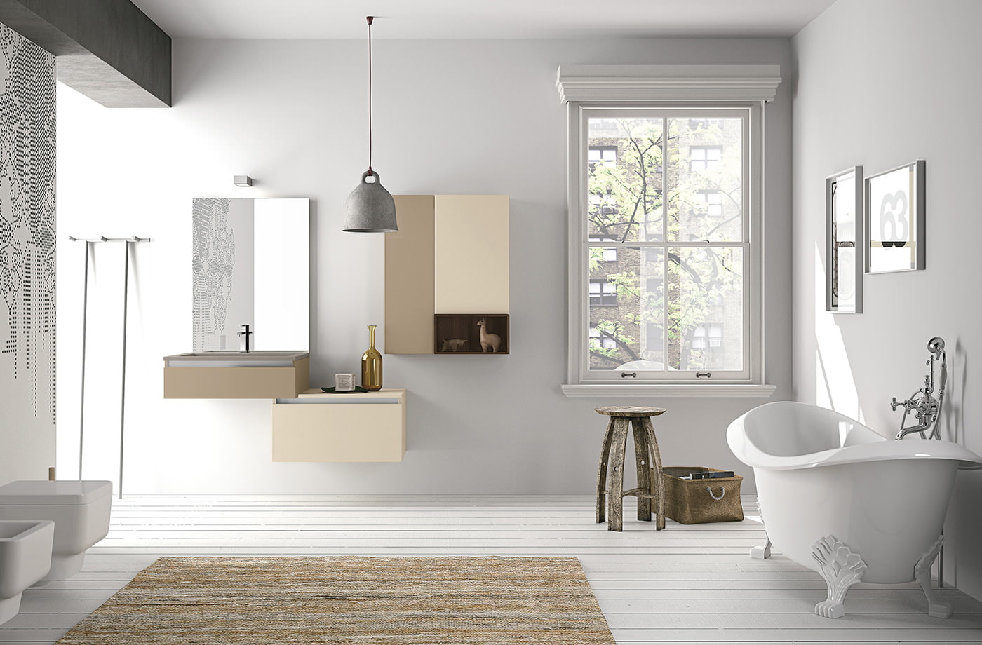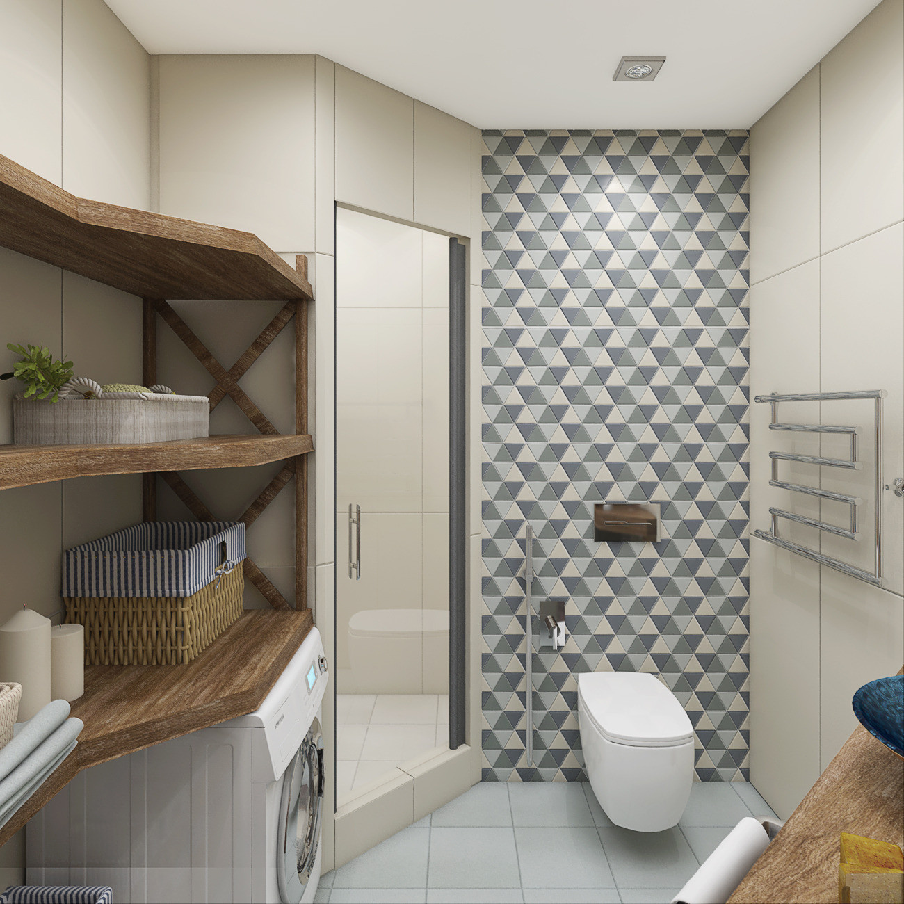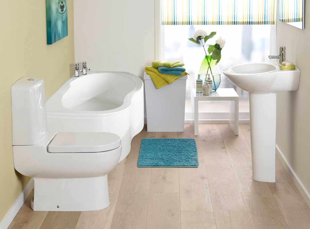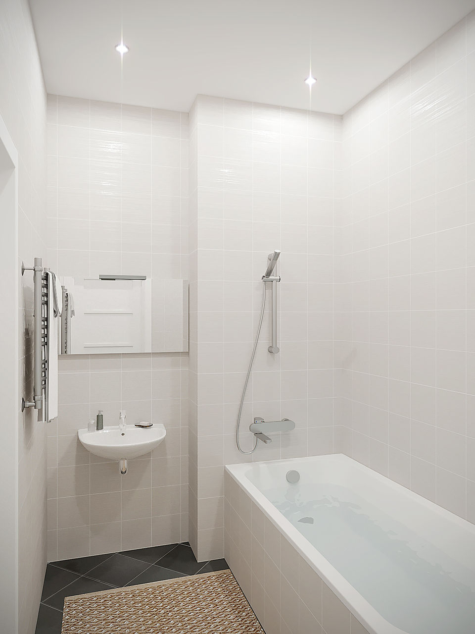 Paredes brilhantes, cerâmicas brancas para artigos sanitários (por exemplo, uma banheira, um lavatório e um vaso sanitário) e elementos de cor de madeira criam a impressão de espaço, ao qual o escândio é tratado com muito cuidado. No entanto, estes interiores harmoniosos coloridos precisam ser estimulados com cores como azul, verde ou rosa em tons pastel. Tons de cinza azul ou cinza também podem ser úteis.