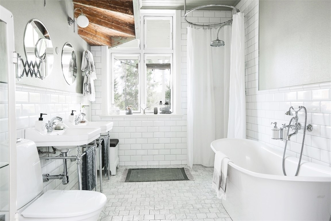 O banheiro principal deve ter acesso suficiente à luz natural das janelas ou clarabóias para permanecer fiel ao design escandinavo. Em casas de dois andares, os banheiros no sótão são ótimos para esse estilo, onde a luz natural é preferida à artificial. Se não for possível obter iluminação natural suficiente, uma iluminação embutida é capaz de imitar a sensação de luz natural, com a qual você pode iluminar toda a sala.