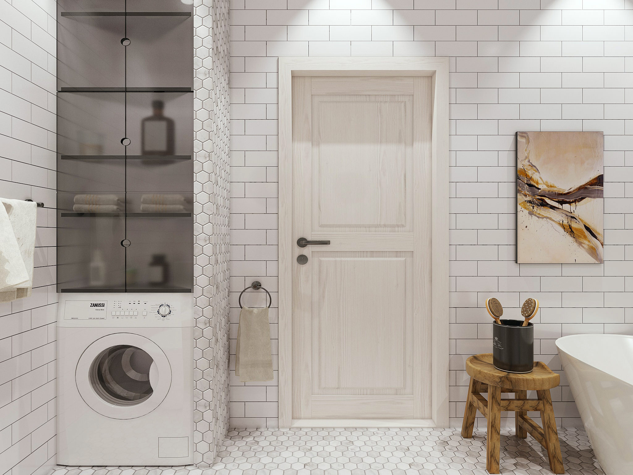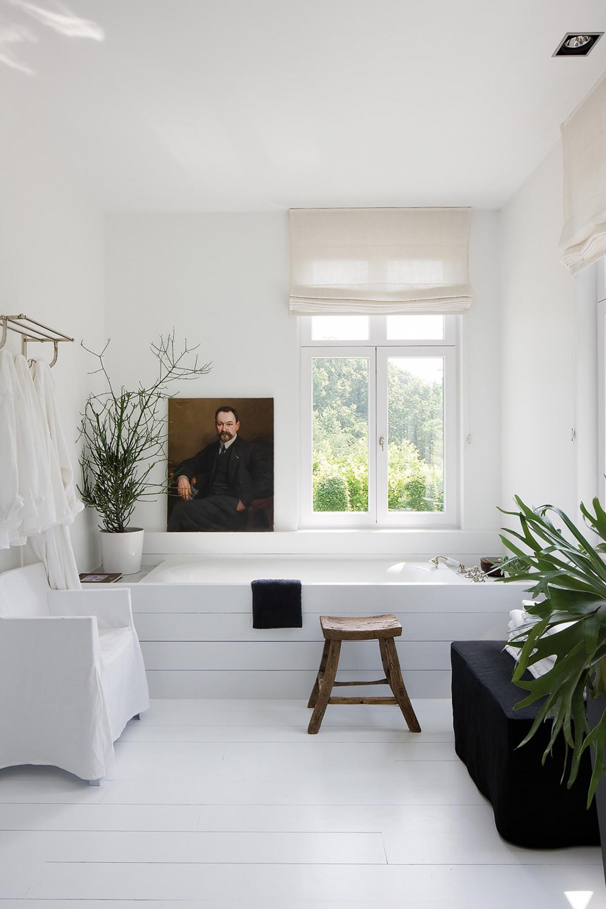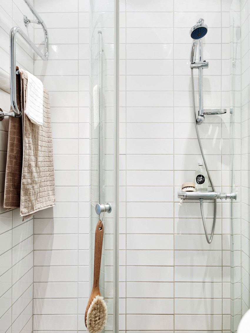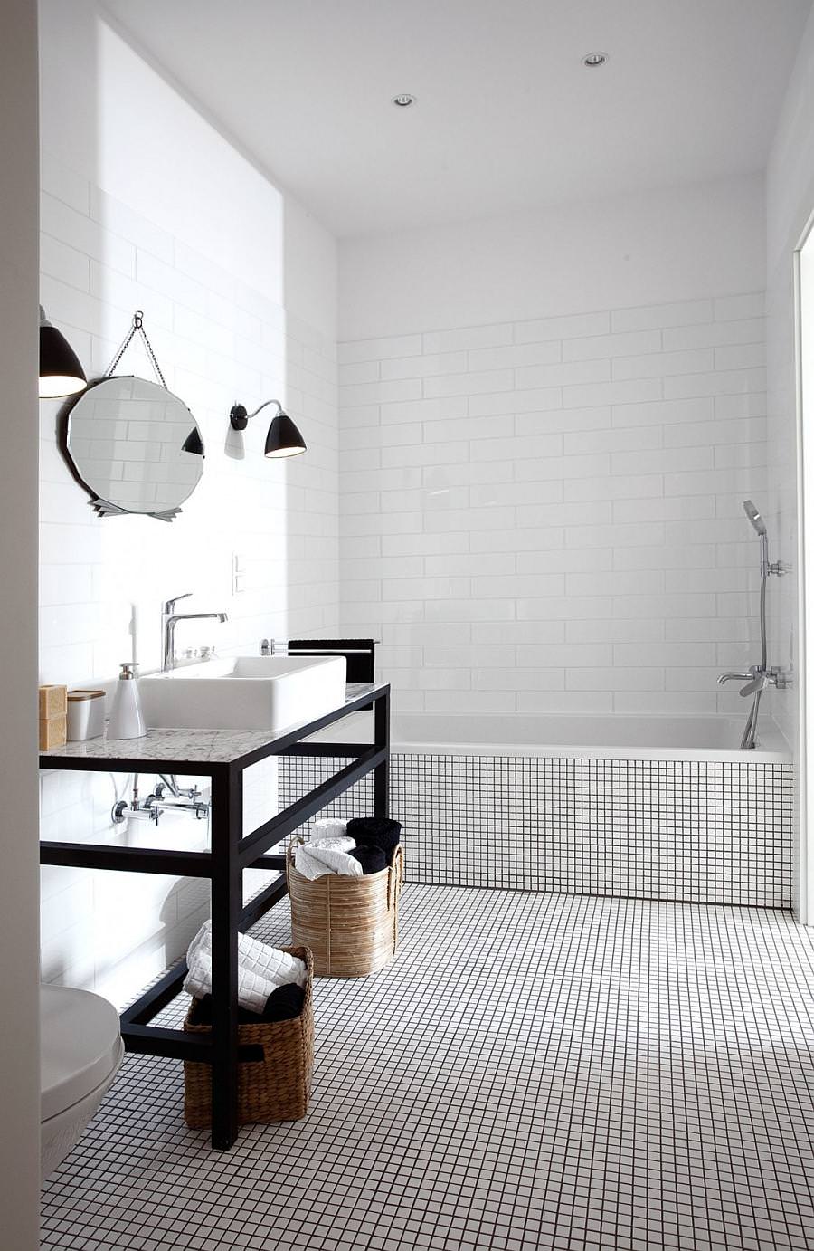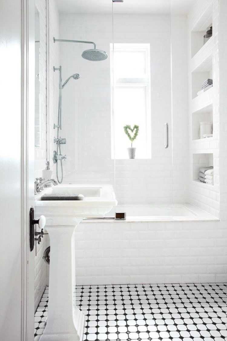 Branco para branco pode parecer ótimo, mas você precisa ter certeza de que seu quarto não é muito estéril. É aqui que o design, textura e pequenos detalhes entram em cena.Preste atenção especial à forma incomum da telha cerâmica, use a cor escura da argamassa de cimento e coloque o ladrilho do piso em um ângulo para dar um efeito não-tradicional e visualmente excitante.