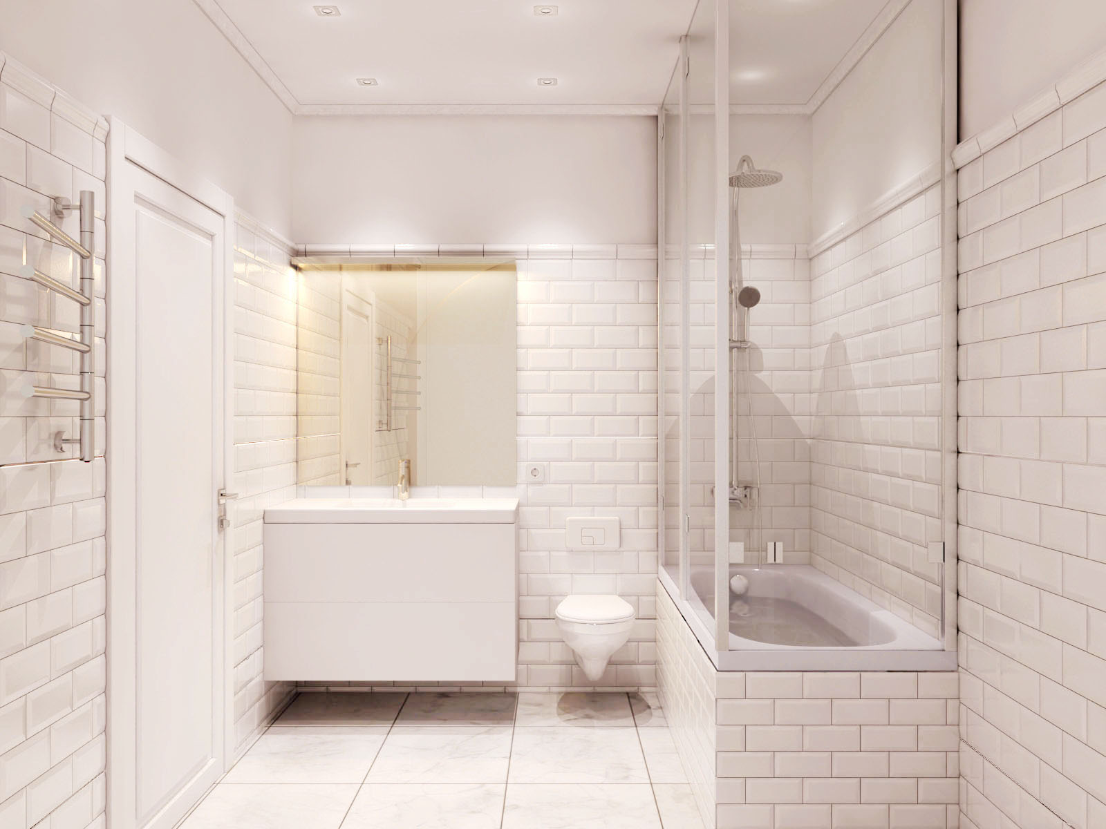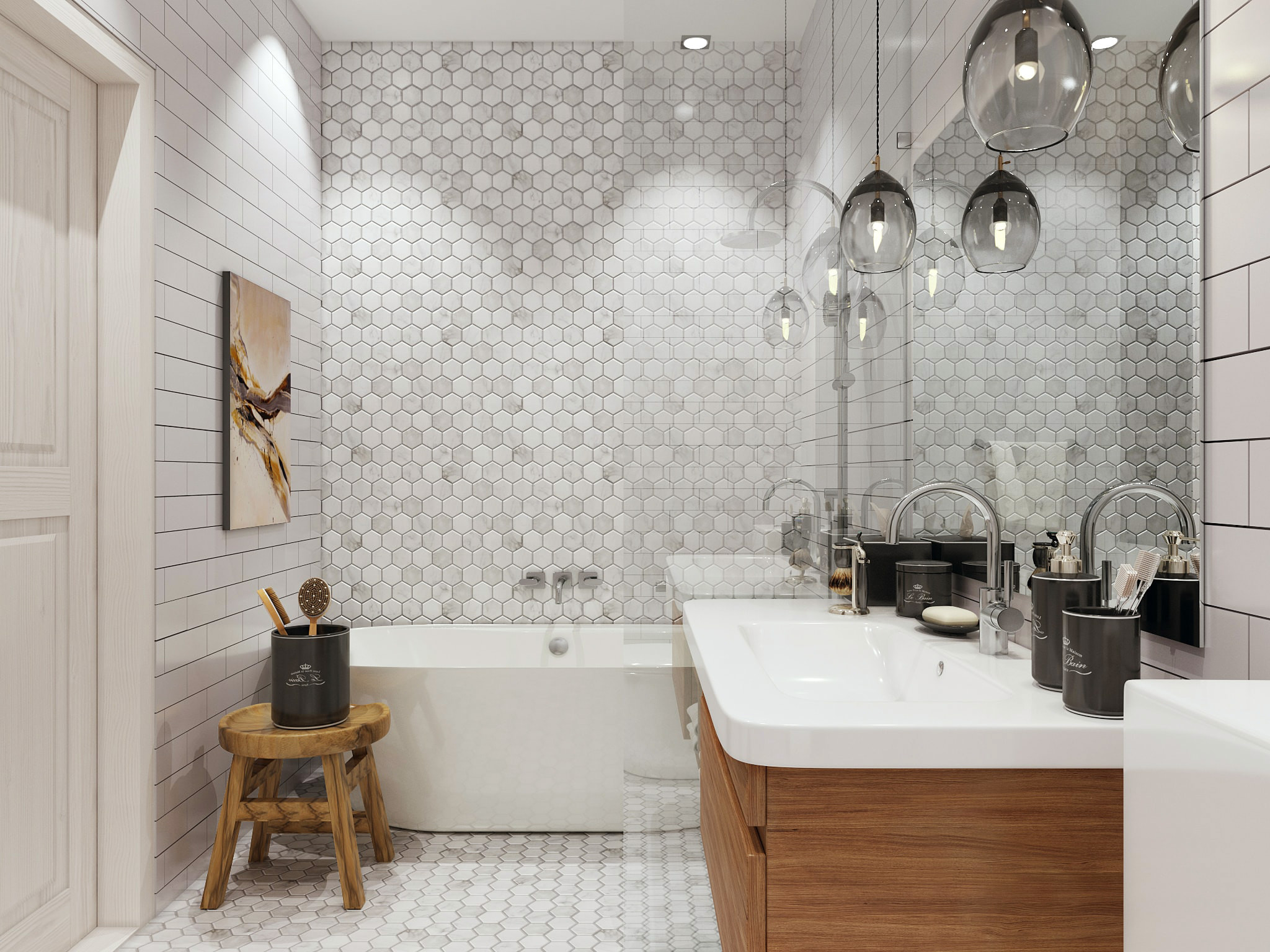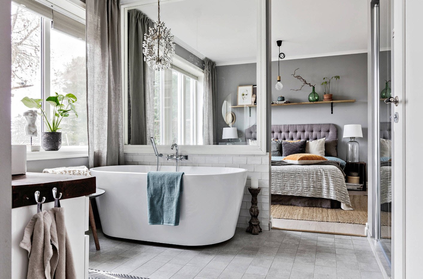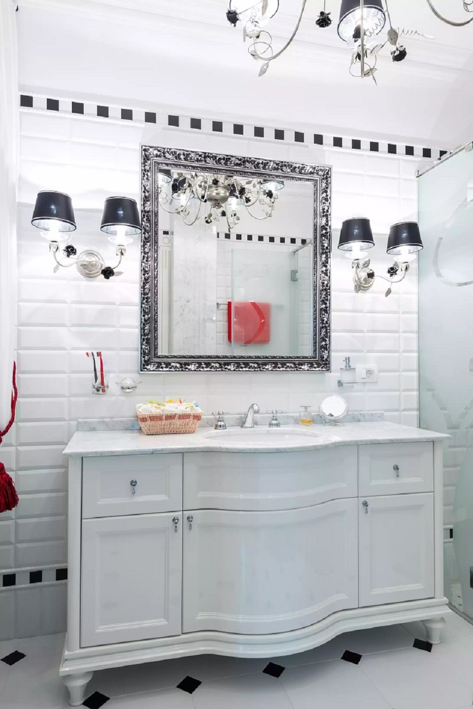 Branco para branco pode parecer ótimo, mas você precisa ter certeza de que seu quarto não é muito estéril. É aqui que o design, textura e pequenos detalhes entram em cena.Preste atenção especial à forma incomum da telha cerâmica, use a cor escura da argamassa de cimento e coloque o ladrilho do piso em um ângulo para dar um efeito não-tradicional e visualmente excitante.