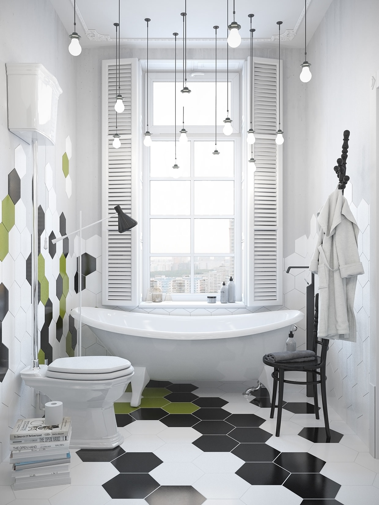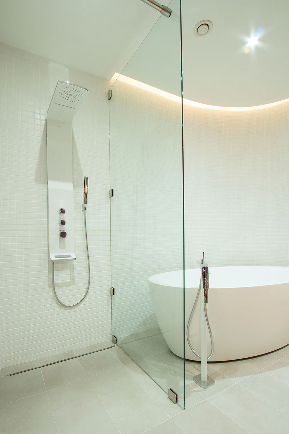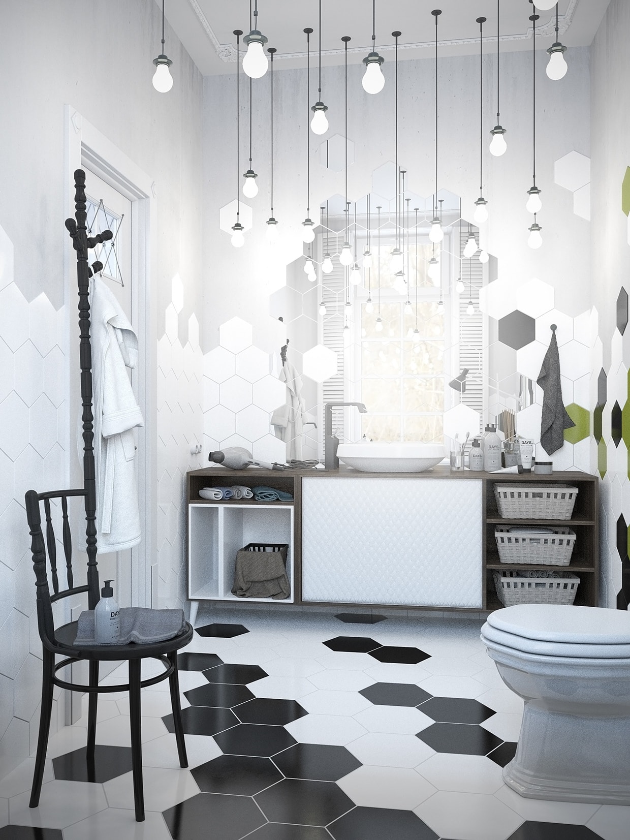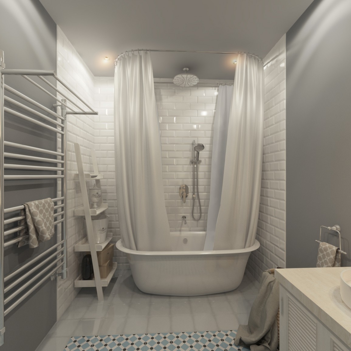 Branco para branco pode parecer ótimo, mas você precisa ter certeza de que seu quarto não é muito estéril. É aqui que o design, textura e pequenos detalhes entram em cena.Preste atenção especial à forma incomum da telha cerâmica, use a cor escura da argamassa de cimento e coloque o ladrilho do piso em um ângulo para dar um efeito não-tradicional e visualmente excitante.