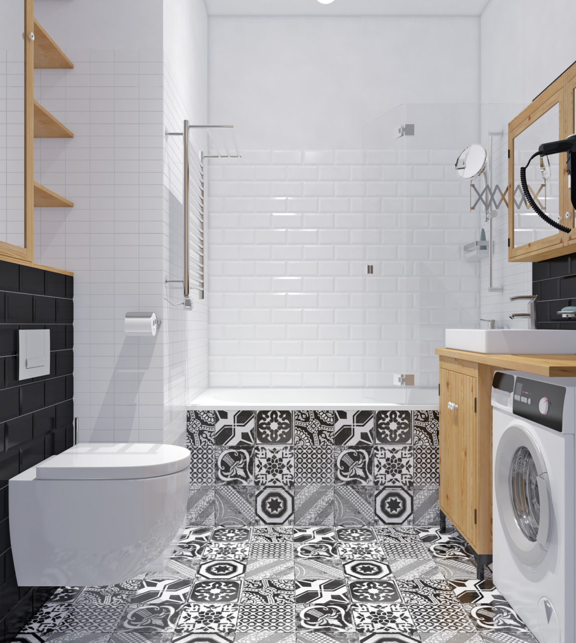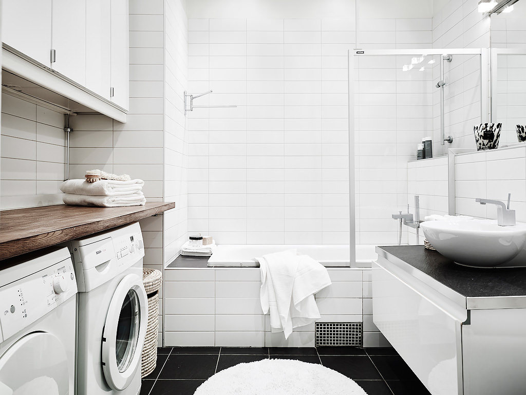 Naturalmente, seu banheiro de estilo escandinavo deve ser branco e de madeira. Mas também é importante trazer algumas cores para o acabamento.
