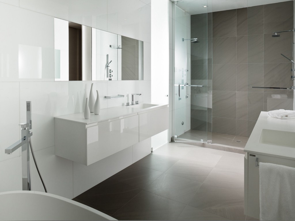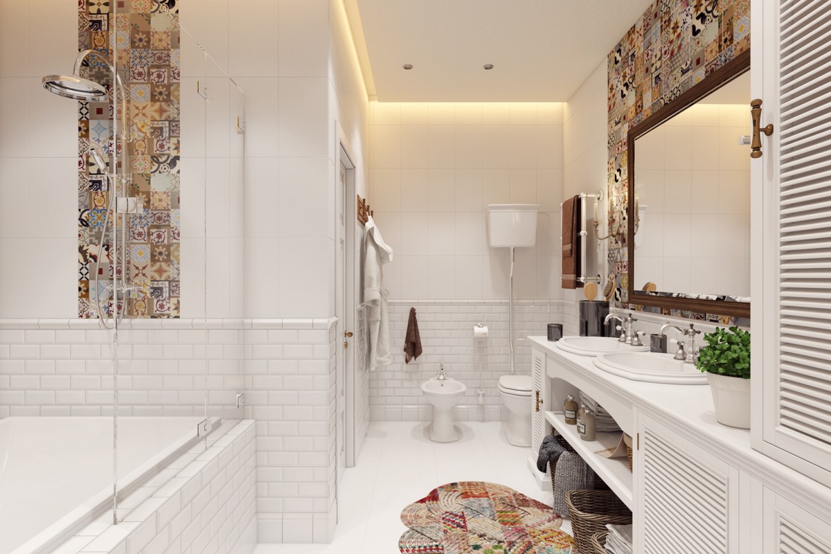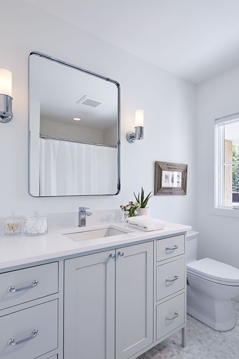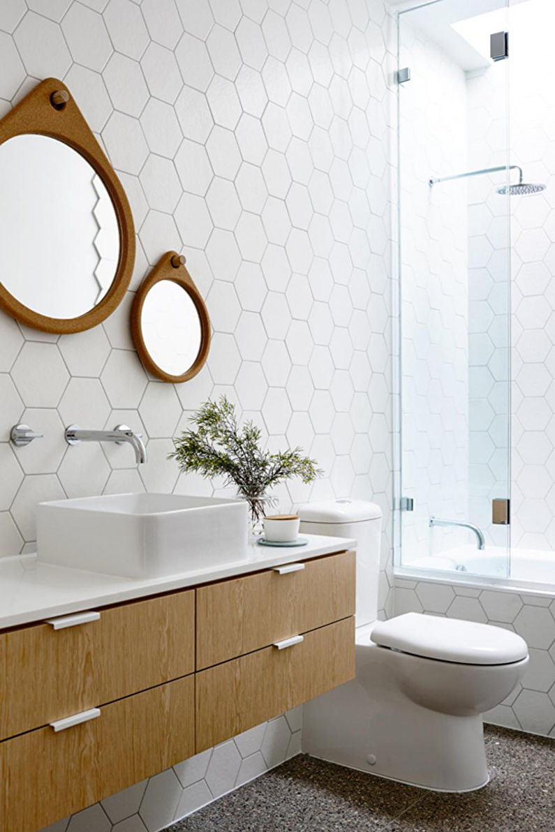 Este estilo de casa de banho é tudo sobre como manter as coisas em minimalismo. A sala tem muitas linhas limpas e formas simples. Você também notará que há uma sensação decente de espaço com espaço suficiente para o fluxo de ar, para este propósito, uma penteadeira com o efeito de voar no ar ou em pernas finas também é escolhida. Isso faz com que a sala se sinta bastante leve, ao contrário de móveis pesados "em o chão».