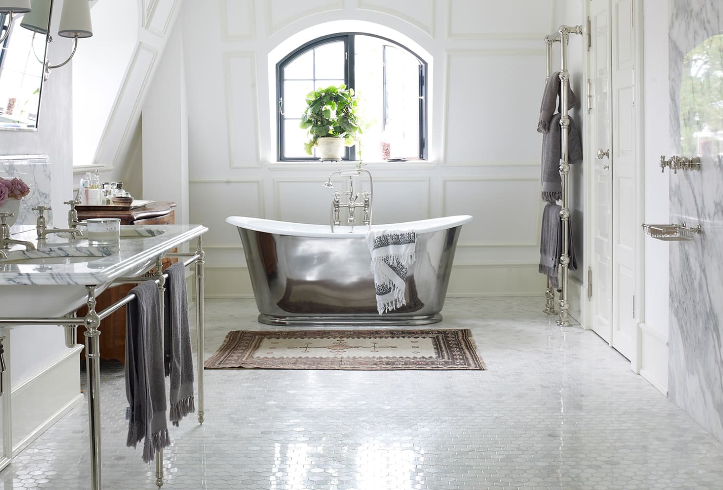 Toques metálicos em tons de cobre ou ouro rosa adicionam calor, mas devem servir como um sotaque, ao invés de dominar um esquema de estilo quente e neutro. O mesmo se aplica ao ferro forjado - toques discretos na forma de banheiras ou estandes dão um toque de charme sem redefinir a quintessência da elegância neutra.