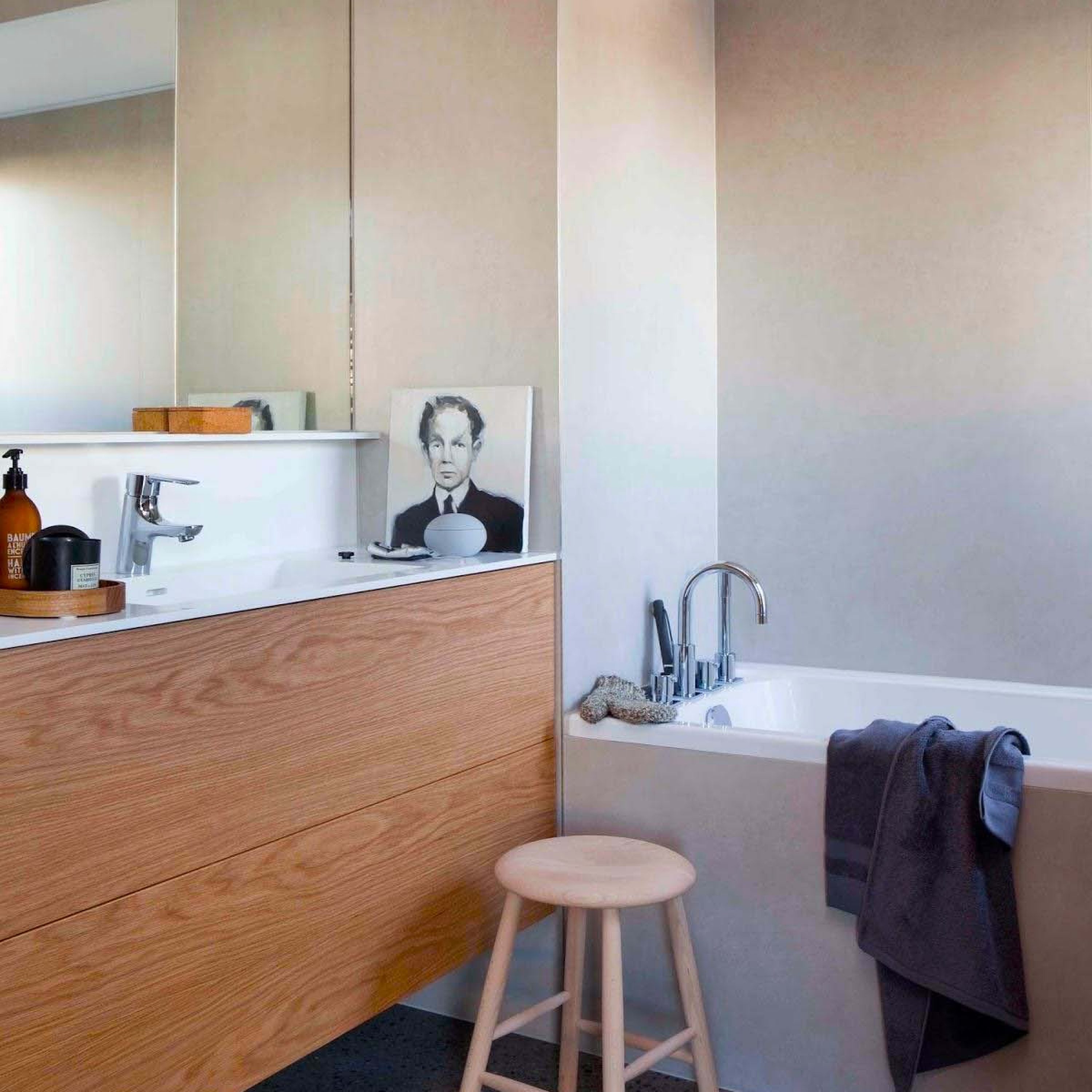Você pode ligar os elementos da pedra natural, mas deixar prateleiras madeira clara ou branca e adicionar tapete de banho de fibra natural.