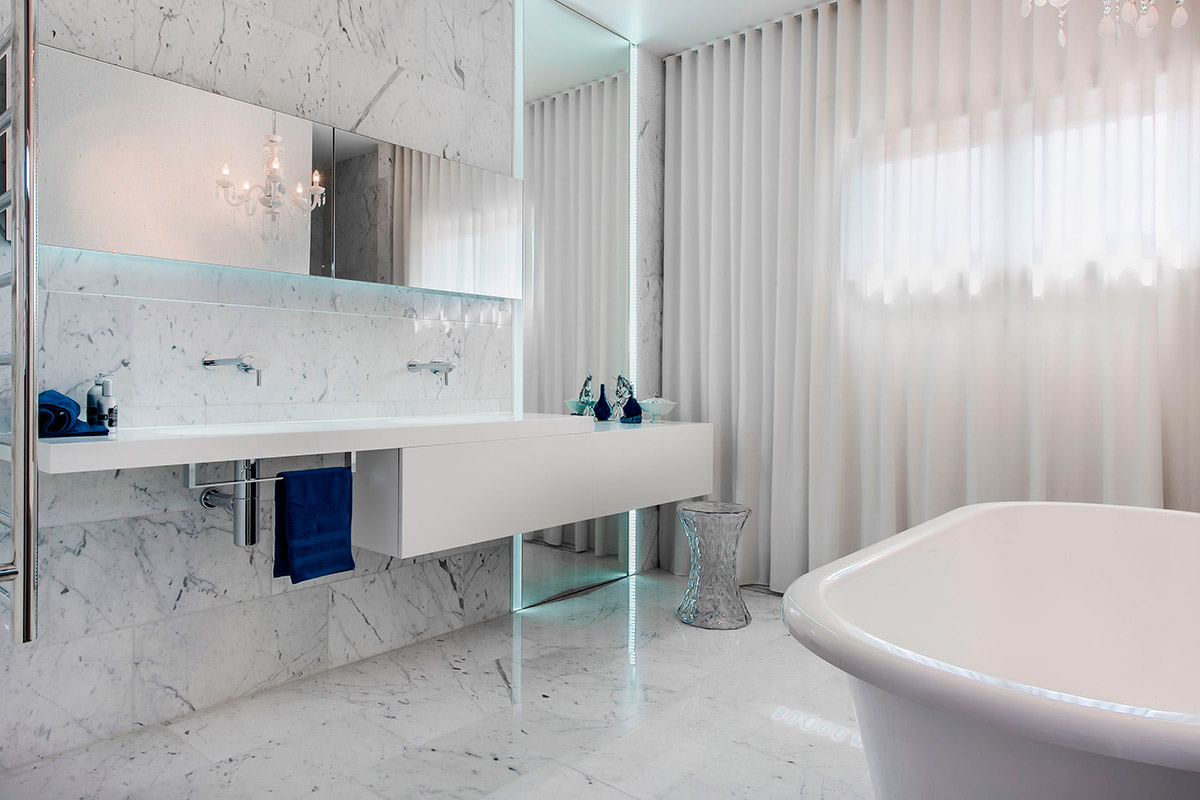 Em um espaço limpo e minimal, você não deve prestar muita atenção ao estilo. Mantenha sua decoração, que você escolheu, bastante simplista, mas interessante. Uma boa adição pode ser peças de couro. Dispensadores de sabão de mármore também são uma ótima idéia que virá a calhar. E mesmo apenas uma pequena quantidade de metal quente pode criar um espaço chique.