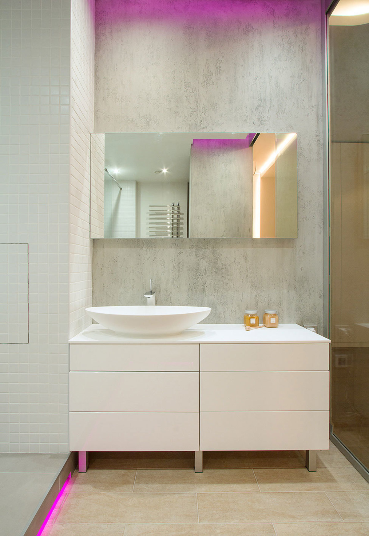 - Imite seu spa em casa adicionando itens como toalhas, tapetes, luz a árvore ou folheado - ou mesmo uma parede totalmente texturizada com um espelho. Deixe o resto das paredes simples e suave.
