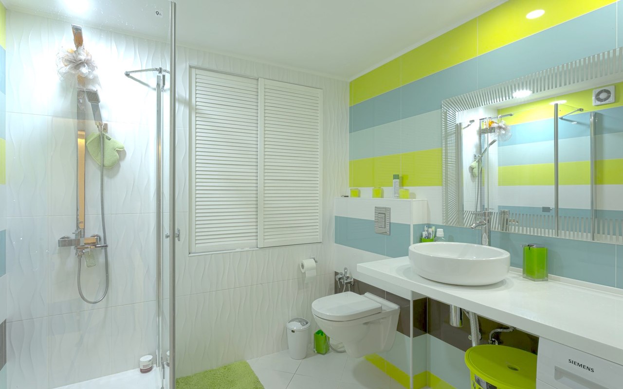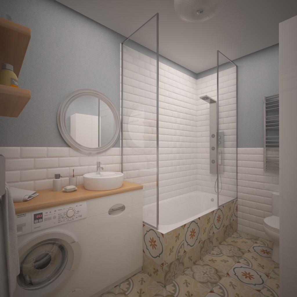 Escolha a melhor combinação de branco, delicado bege, cinza e marrom, bem como paleta azul e verde para o seu pequeno banho.Não faça uma desvantagem na árvore - de preferência em tons brilhantes, que tenham o conforto e o calor.