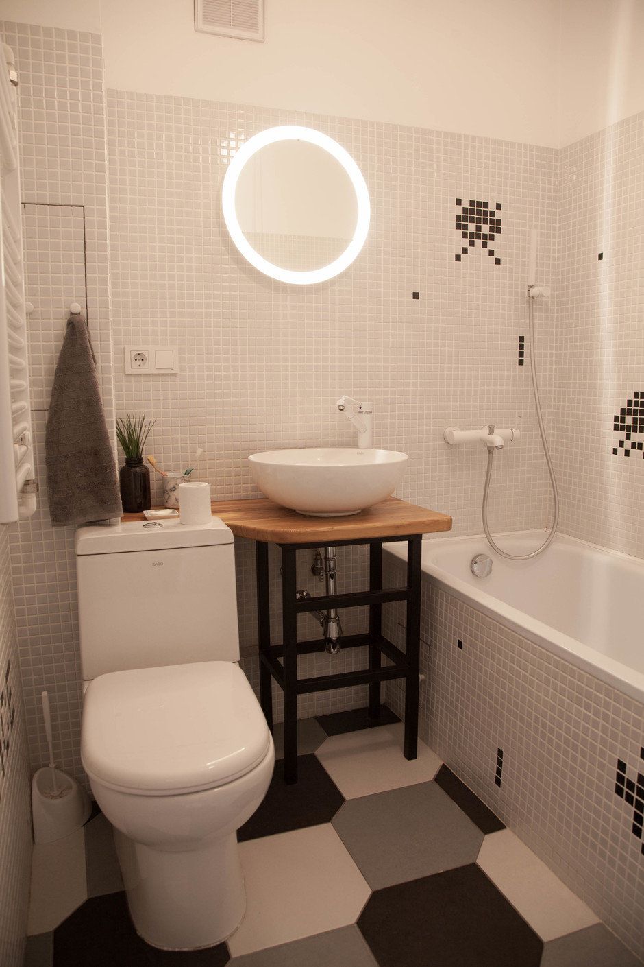 - Use um esquema monocromático. Um banho preto com paredes cinza funcionará lindamente, mas tenha cuidado com o espaço para mantê-lo não muito moderno, mas para a atmosfera e a leveza.