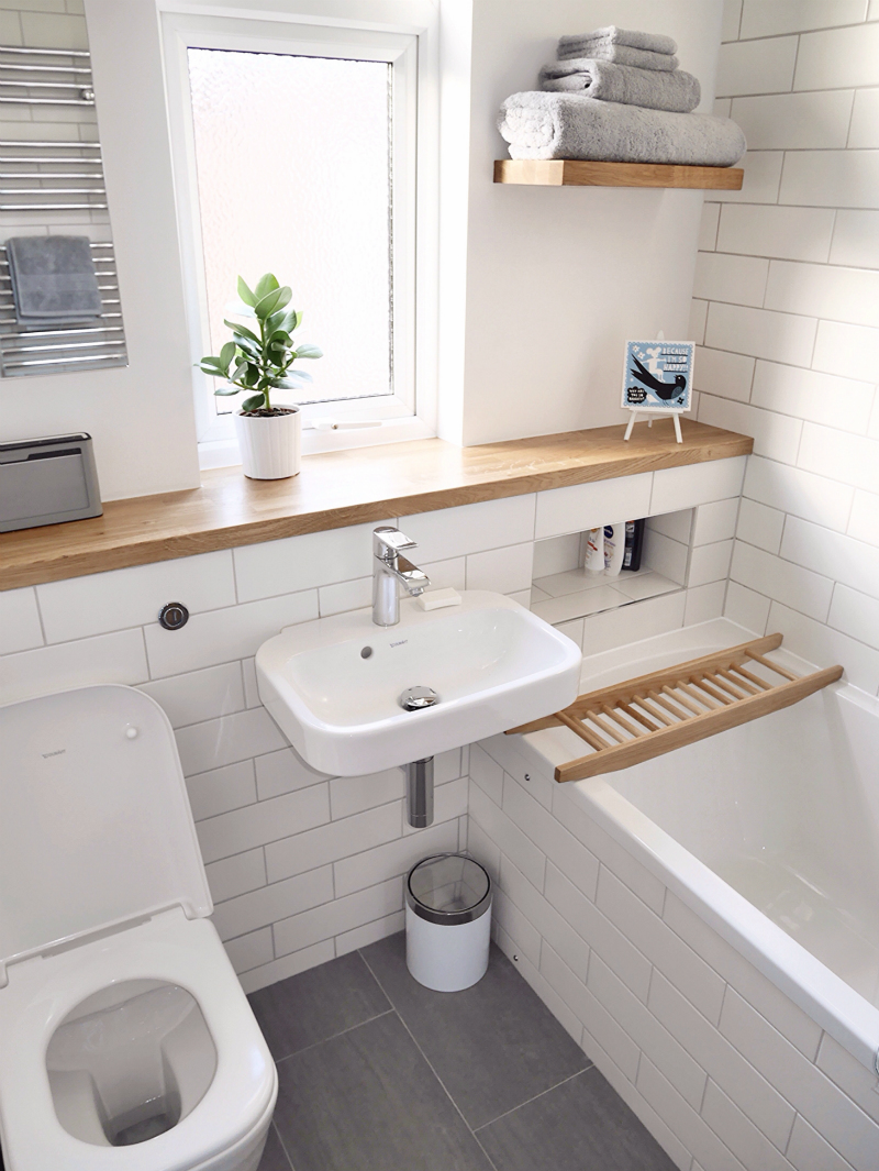 Uma sala de estilo Scandi sempre contém um fundo branco brilhante com madeiras quentes e o banheiro não é diferente. Então pense em onde você pode inserir uma madeira polida, adicionando-lhe uma pedra branca para criar uma agradável sensação de equilíbrio.