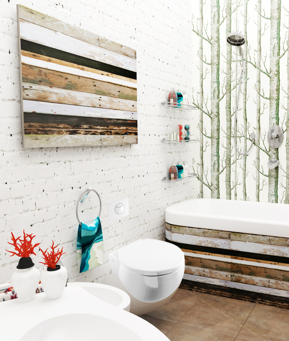 Outra ideia de organizar um pequeno banheiro de estilo escandinavo é o uso de cerâmica telhasimitando madeira. O resultado é ideal porque combina as vantagens do azulejo, que estão na extrema praticidade deste material de acabamento, em combinação com a beleza e o calor da madeira.